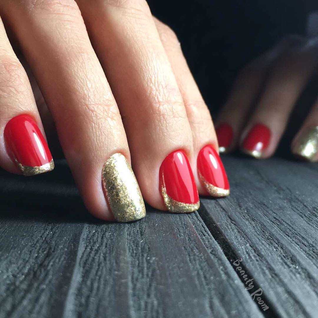 В тренде однотонный красный маникюр с выделением золотыми блестками безымянного пальца и мизинца. Пример такого нейл-арты вы можете видеть на фото ниже. Как видите, дизайн смотрится элегантно и сдержанно, он с успехом может использоваться даже для повседневных образах. Также популярен французский маникюр с золотым декором по краю ногтевой пластины, дизайн с растяжкой блестками, лунный маникюр. Красно-золотой декор великолепно смотрится как на длинных, так и на коротких ногтях. В последнем случае рекомендуется использовать гель-лаки, в состав которых входят золотые блестки, пайетки.