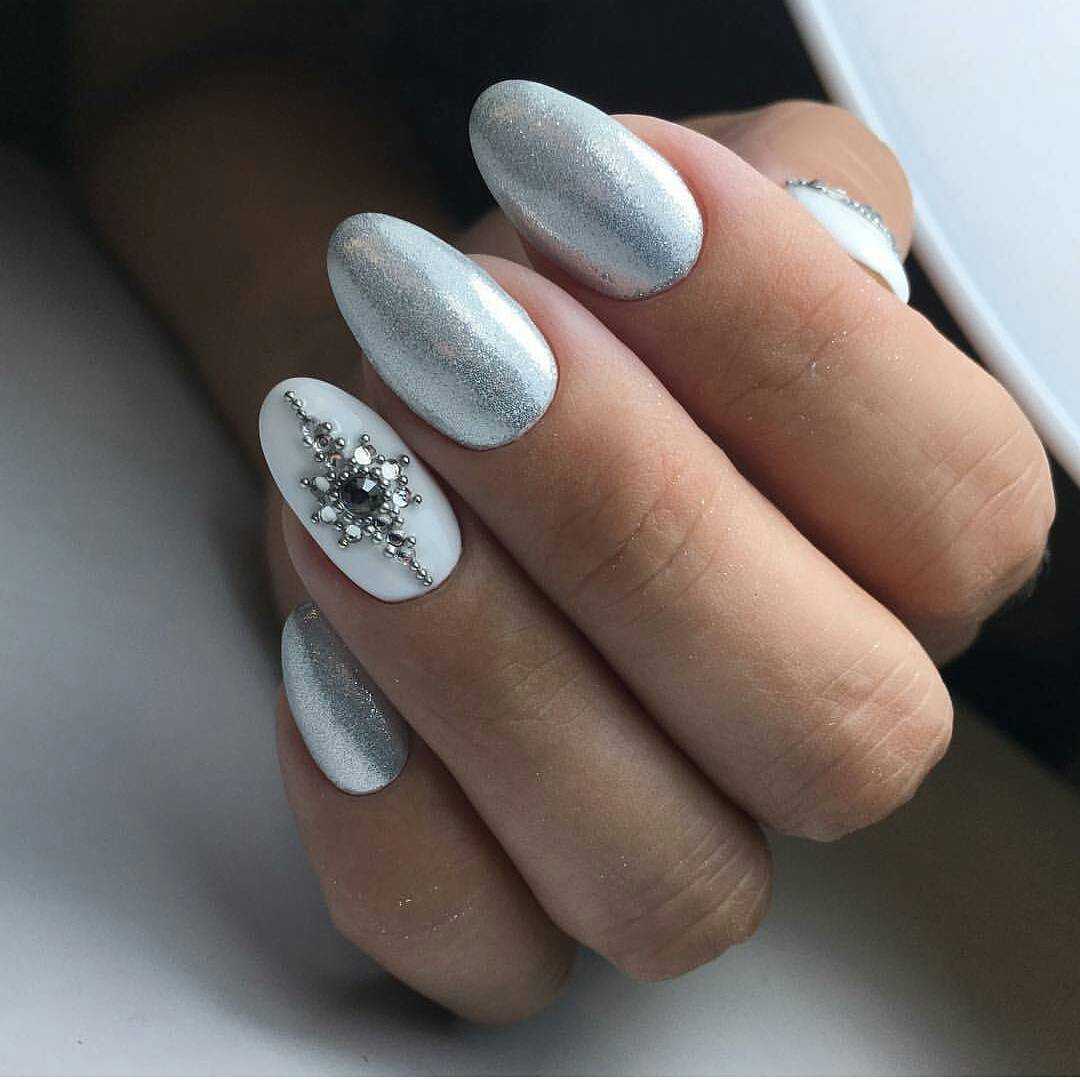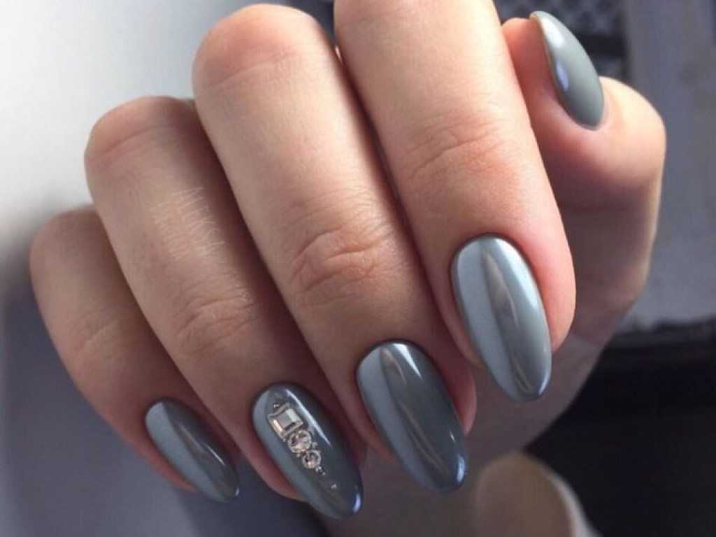 Мы уже не раз упоминали в наших публикациях о гармоничном сочетании в маникюре такого декора как стразы и блёстки, поэтому не украсить серые ноготки подобным шедевром, было бы большим упущением. Сверкающие частицы прекрасно дополняют любой вид оформления, будь то предельно сдержанный минимализм, дизайн в романтическом стиле или маникюр для вечернего образа. Украсьте узором из страз улыбку френча или основание ноготков, дополните акцентным камушком и россыпью блестящих частиц рисунки, выделите сверкающей композицией ноготок на безымянном пальце – любой из примеров смотрится великолепно и преобразит маникюр.