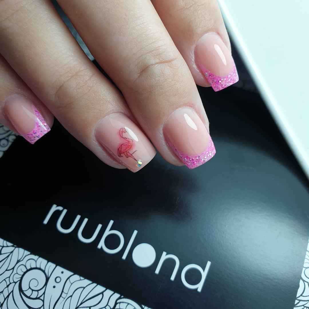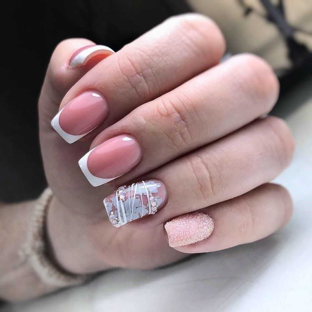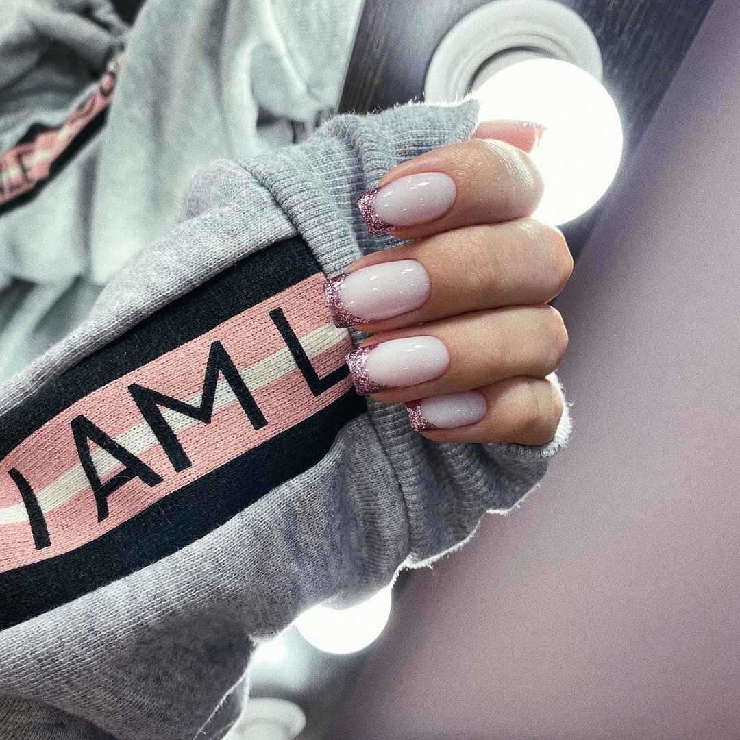 И, конечно же, мастера не могли не нанести их на нежно-розовый френч. К тому же цвет этих блесток далеко не всегда розовый, но при этом каждый из вариантов выглядит свежо и очень привлекательно.
