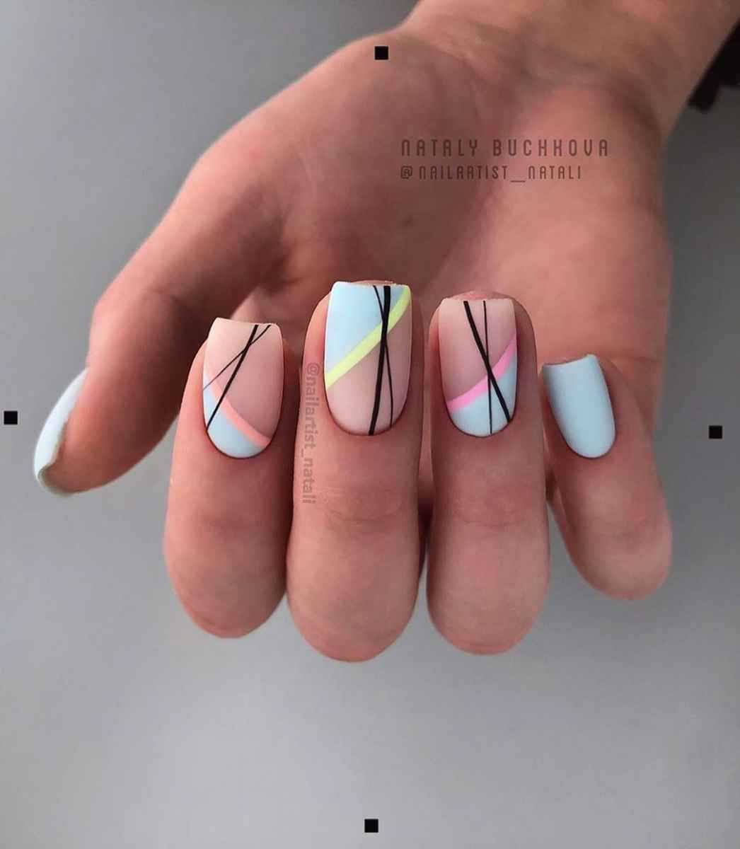 Полоски размещают вдоль, поперек и полукругом. Это модный дизайн, который не займет много времени, но при этом сделает маникюр стильным.