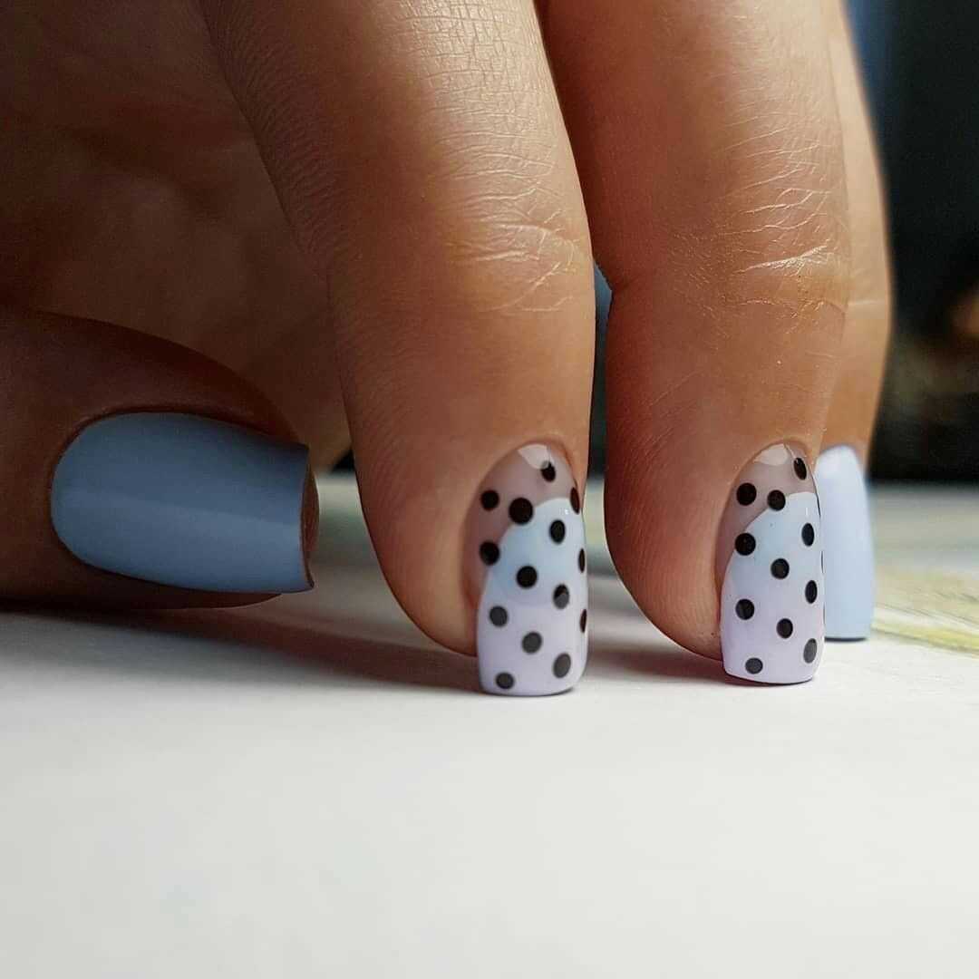 С принтом в горошек знакома каждая девушка. Он актуален не только для одежды, аксессуаров, но и для оформления ногтей. Тем более, что фон в виде покрытия голубого цвета идеально для этого подходит. Данный принт не слишком сложный, поэтому сделать его можно в домашних условиях. Конечно же, наиболее симметрично и четко его наносят, используя дотс. Это специальный инструмент с металлическим наконечником круглой формы. Он может быть разного размера. Именно с его помощью и получается отпечатать рисунок на ногтевую пластину. Что касается цветового решения, то на голубом фоне прекрасно смотрится черный и белый принт. В таком случае маникюр получается достаточно ярким, заметным.