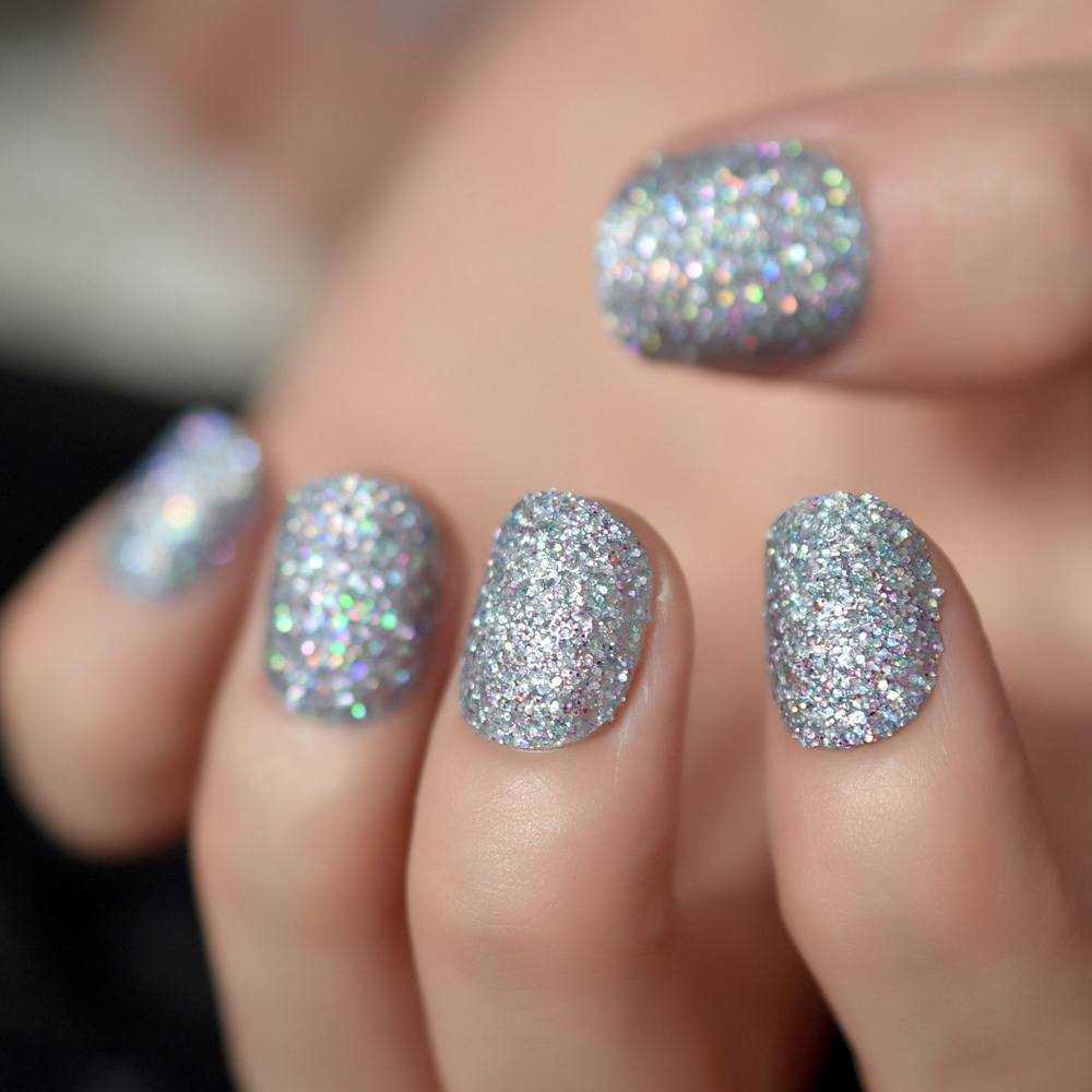 Сухие блестки могут быть разного размера и расцветок. Оттенок выбирайте в зависимости от тематики маникюра и предстоящего образа. Для повседневных образов предпочтителен серебряный оттенок, для летних, праздничных и других торжественных случаев можно использовать яркие насыщенные тона.