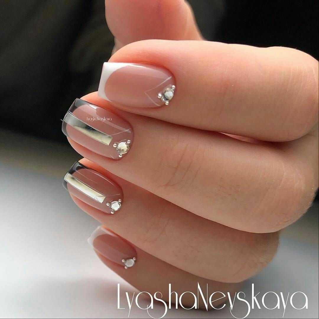 Такой маникюр отлично подойдет как к офисным комплектам, так и к шикарным вечерним нарядам. Необязательно следовать стандартной линии улыбки. Не стесняйтесь экспериментировать. Очень изысканно смотрится треугольная улыбка с нежными розовыми линиями сверху. При желании нейл-арт можно украсить украшениями.
