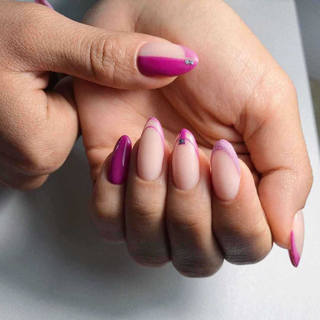 Асимметричный жакет вы вольны разбавить практически любым цветом при условии, что они будут сочетаться с основным розовым. Также не забывайте, что качественно выполнить эту технику сможет только специалист с большим опытом, иначе можно получить несколько неаккуратный маникюр с неточными линиями и углами.