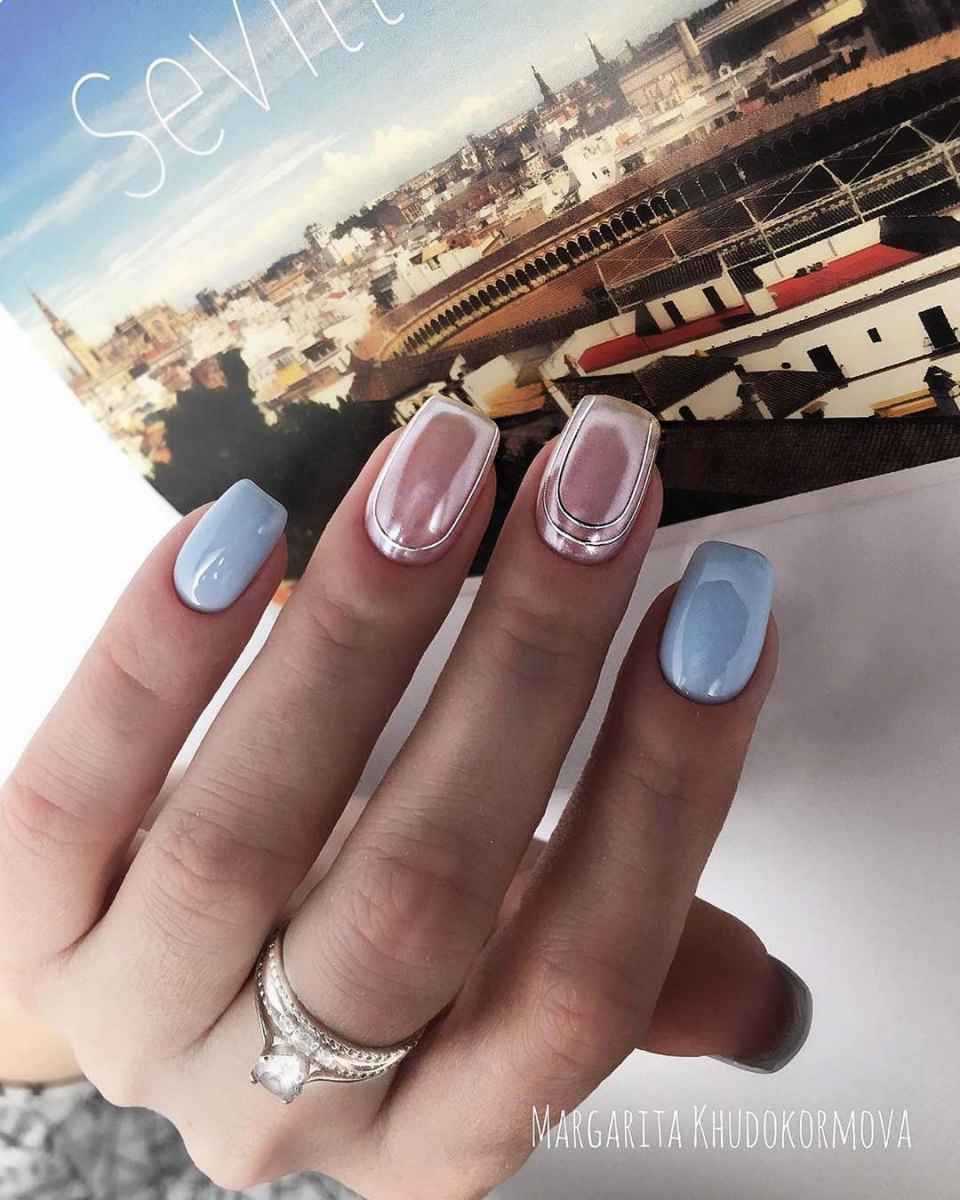 Даже на фото она очень красива, а в жизни, переливаясь под лучами света, она покорит внимание любого, без исключений. Выбирайте жемчужную, зеркальную и хромовую втирку, они лучше остальных работают в тандеме с розовыми оттенками