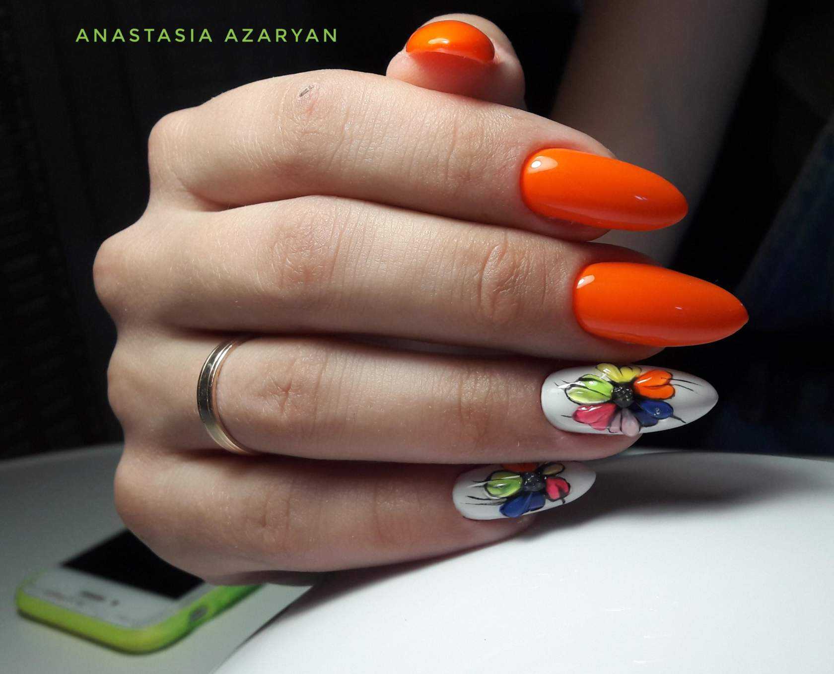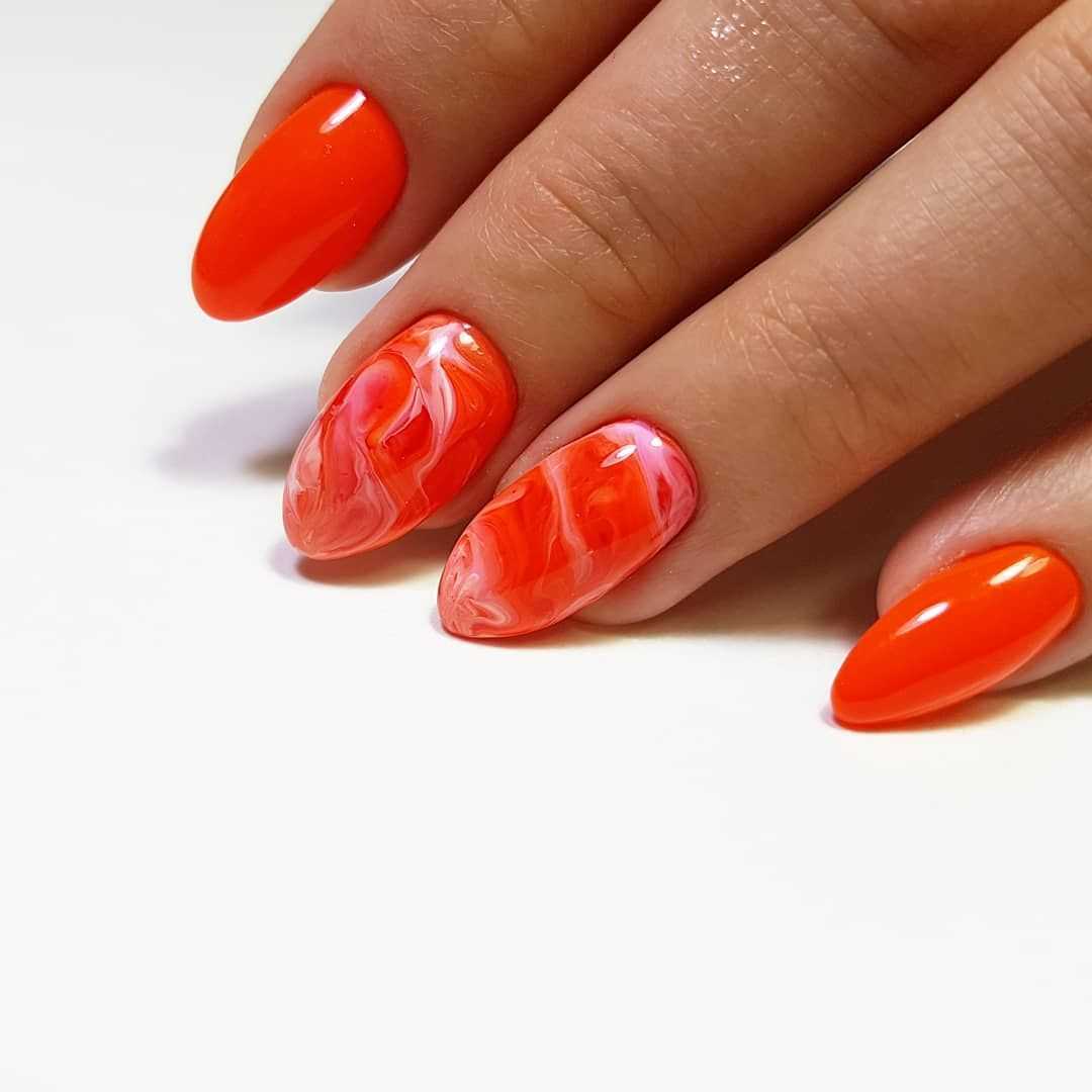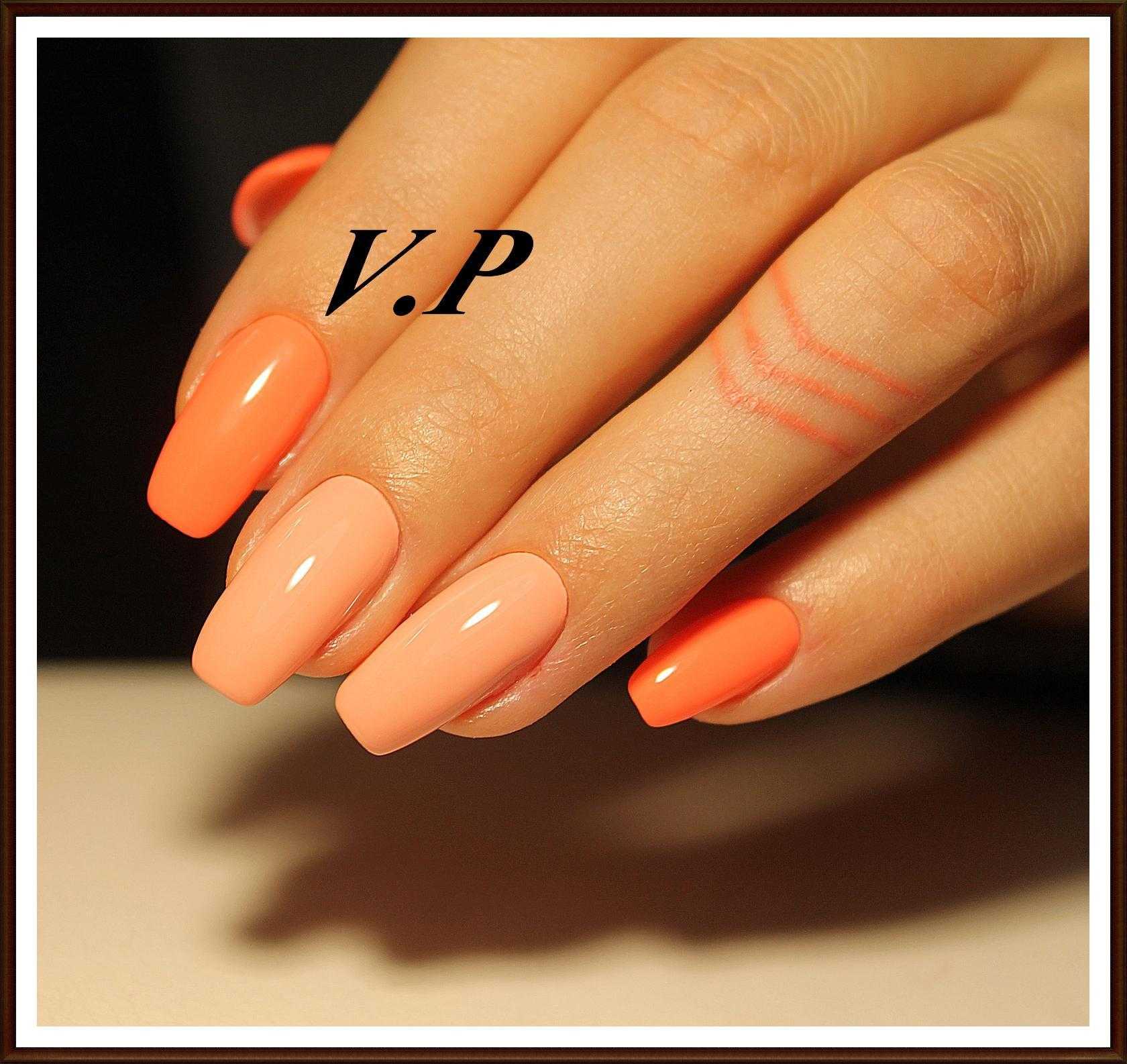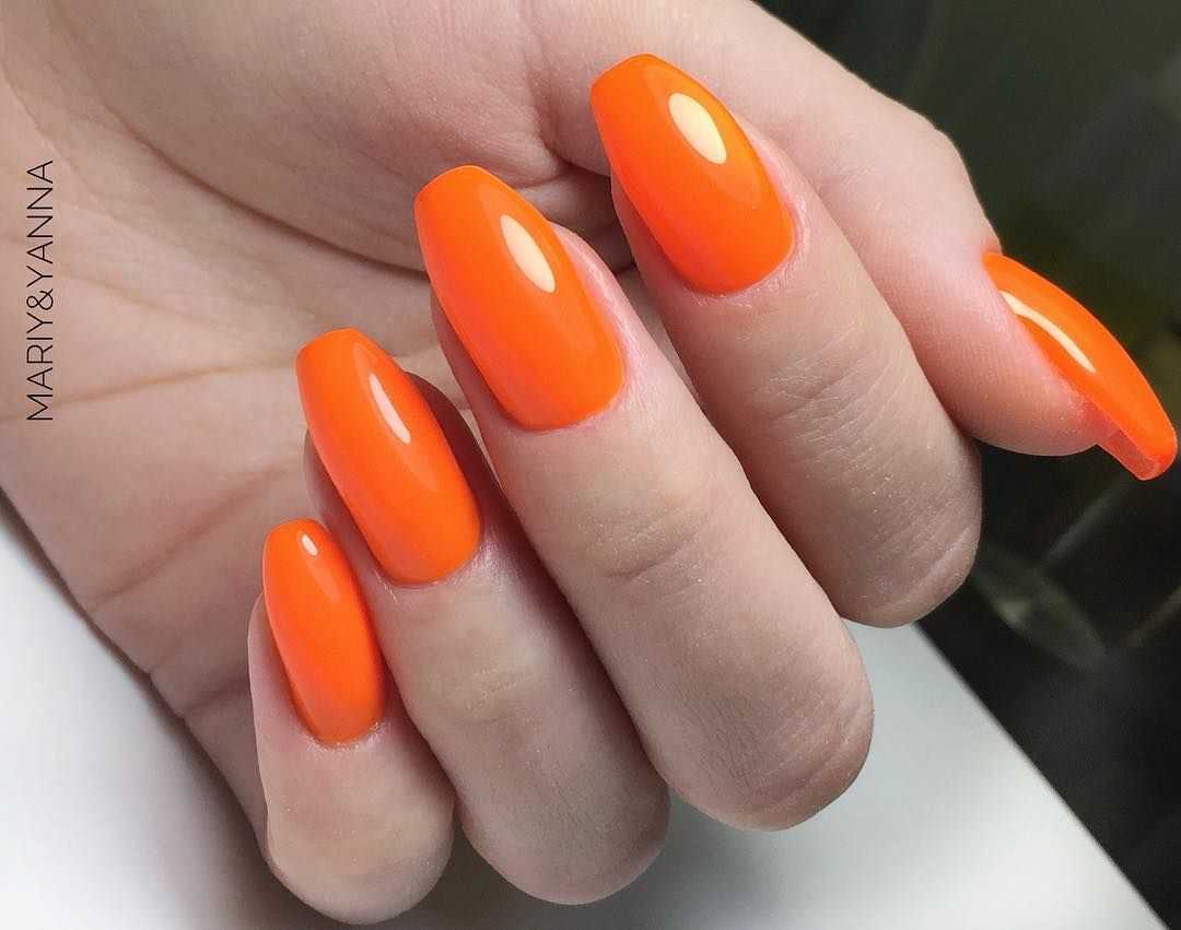 Оранжевый оттенок будет давать глубину, что с эстетической точки зрения немаловажно для ногтей такой длины, и визуально удлинять их. Тут важна сдержанность и лаконичность, поэтому лучше отдать предпочтение одному оттенку на всех ноготках