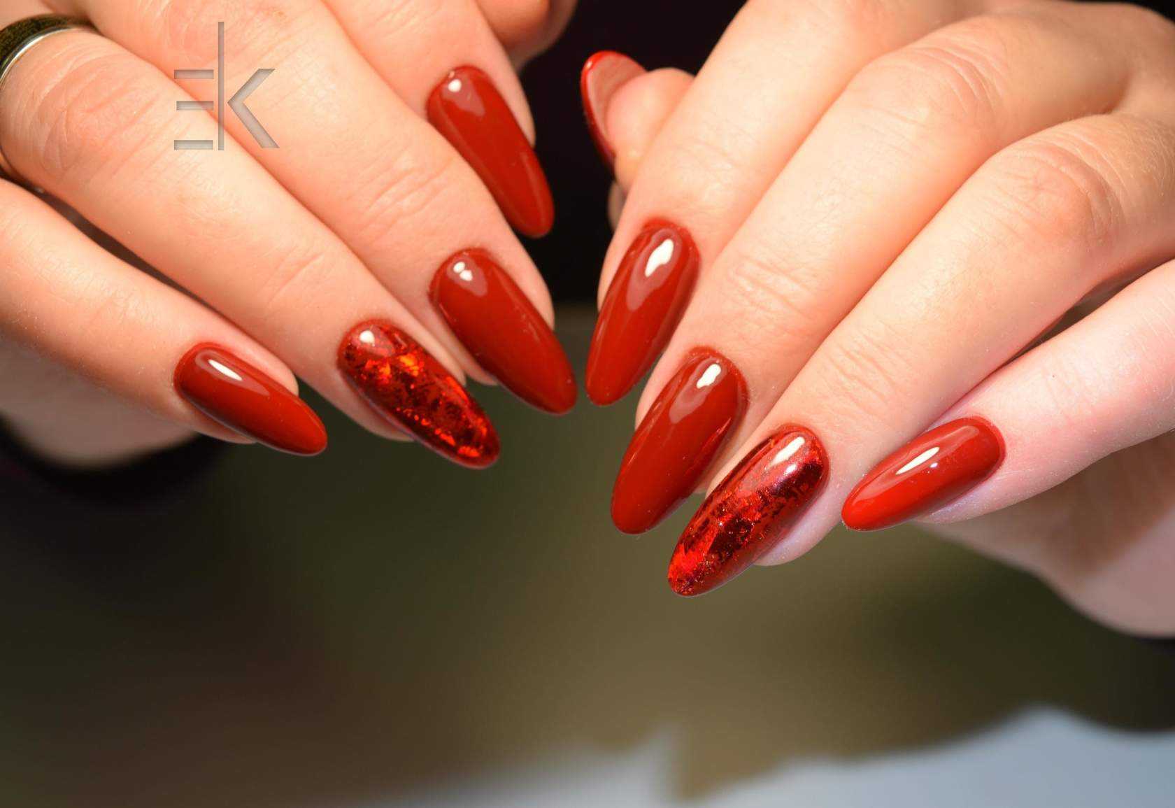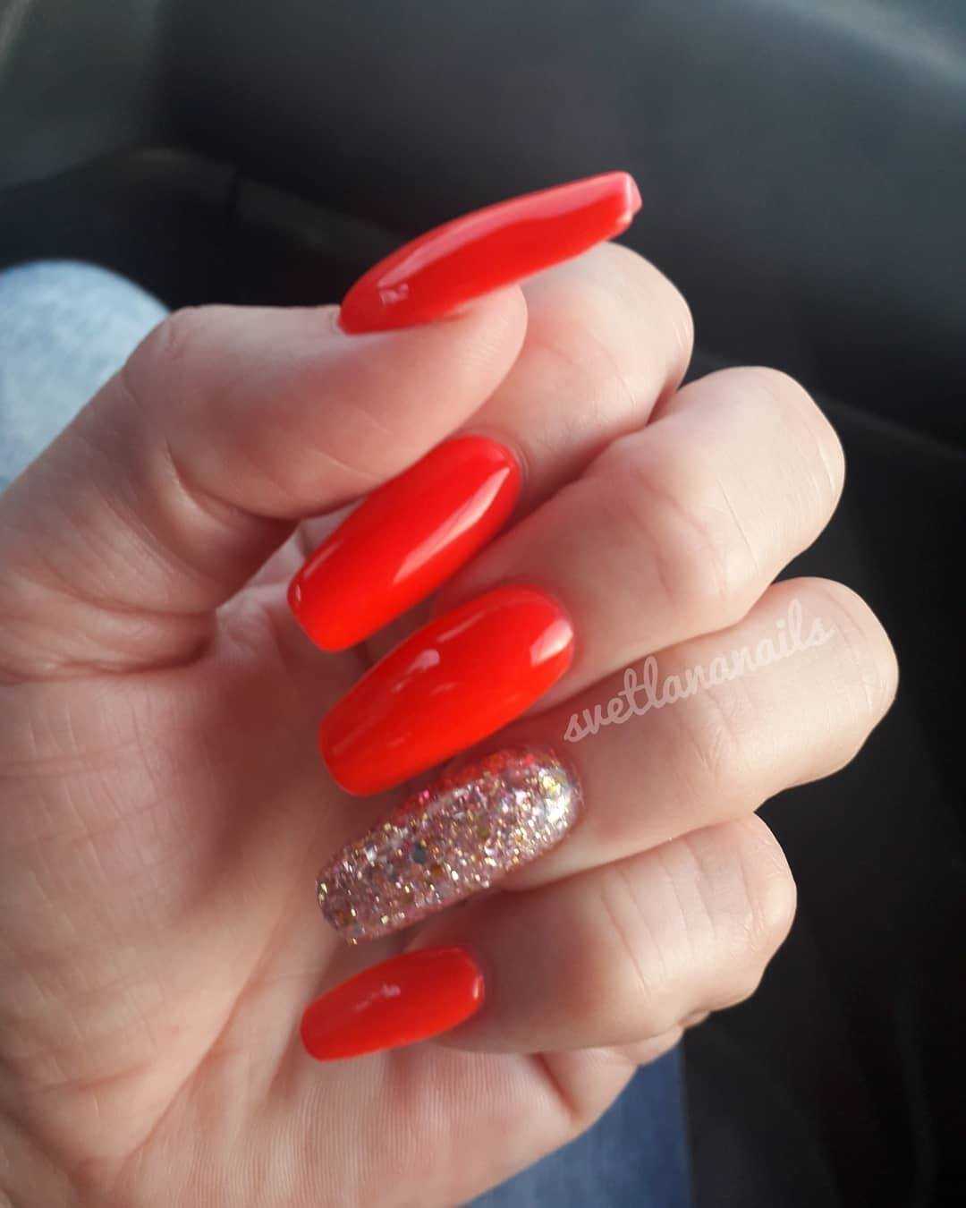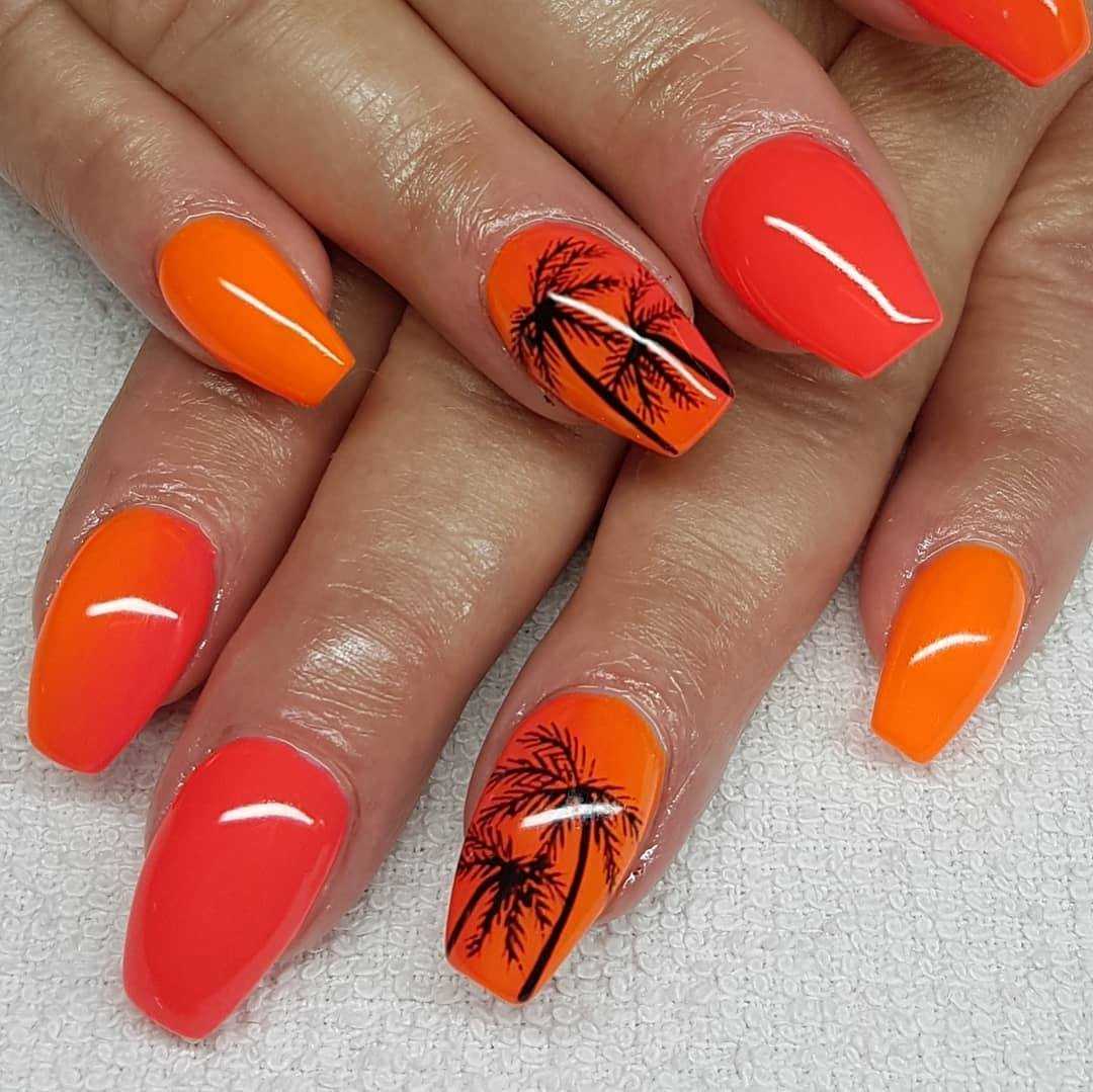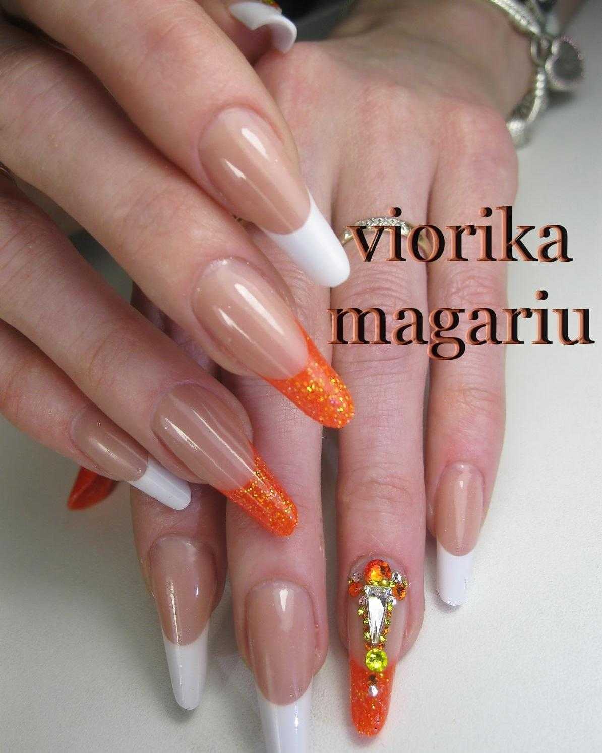 Оранжевый оттенок будет давать глубину, что с эстетической точки зрения немаловажно для ногтей такой длины, и визуально удлинять их. Тут важна сдержанность и лаконичность, поэтому лучше отдать предпочтение одному оттенку на всех ноготках
