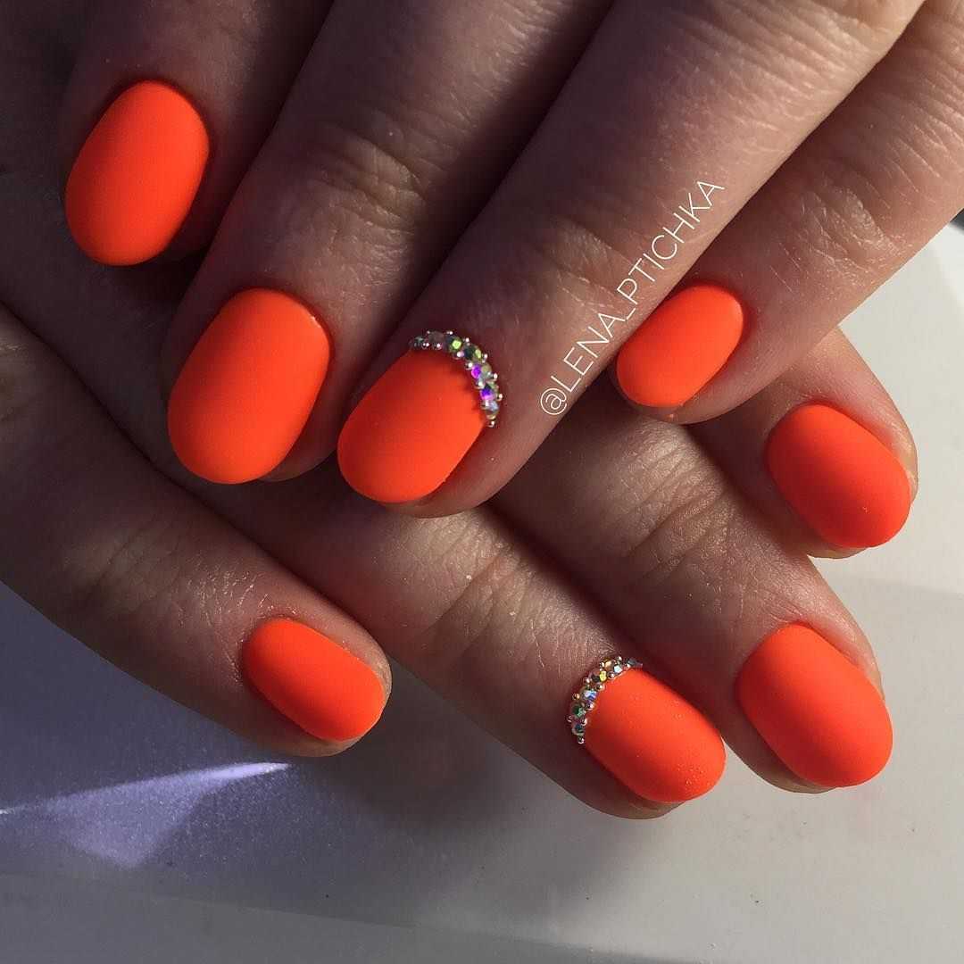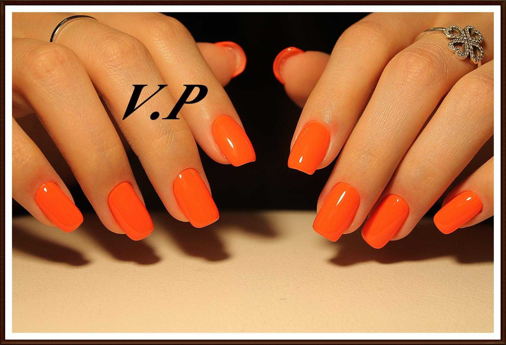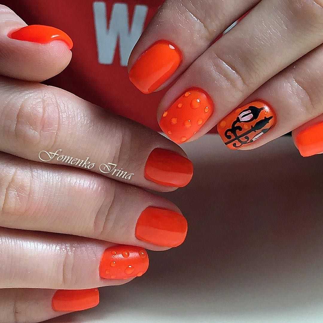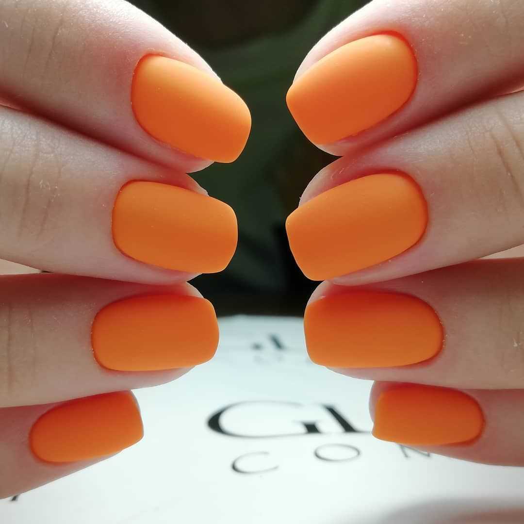 Обладательницам и любительницам коротких ногтевых пластин, придётся по вкусу маникюр в оранжевом цвете. С таким покрытием ноготки будут смотреться объёмнее и насыщенней