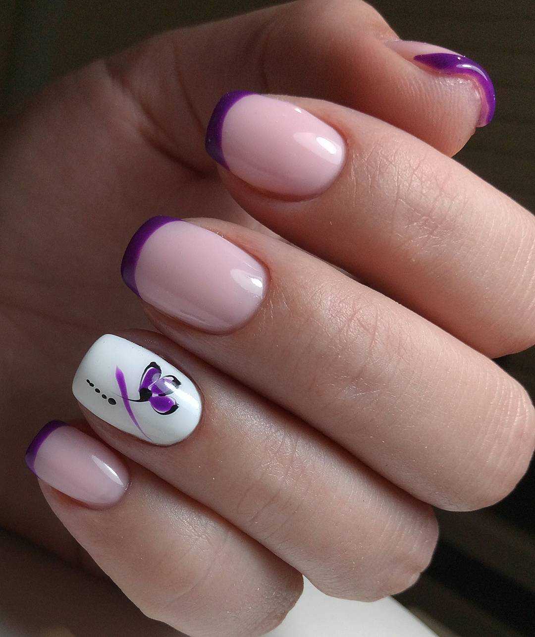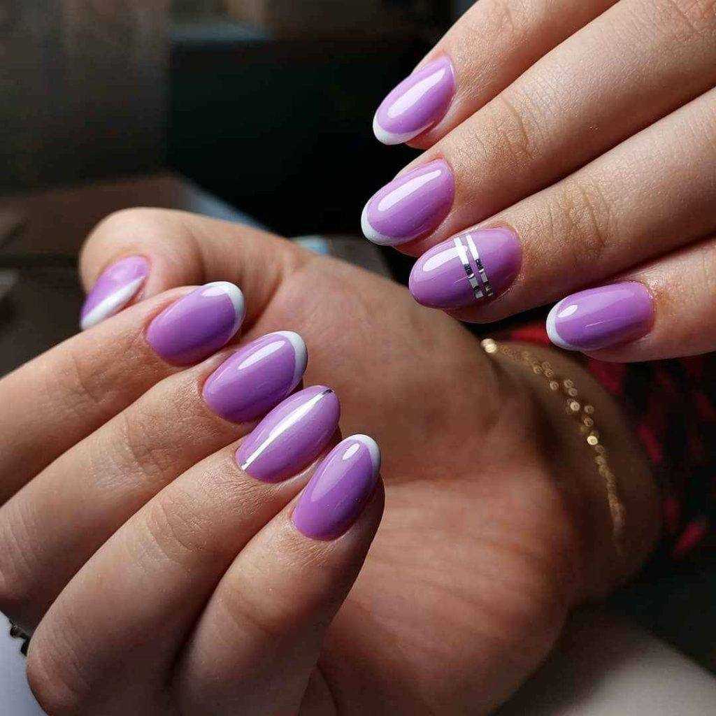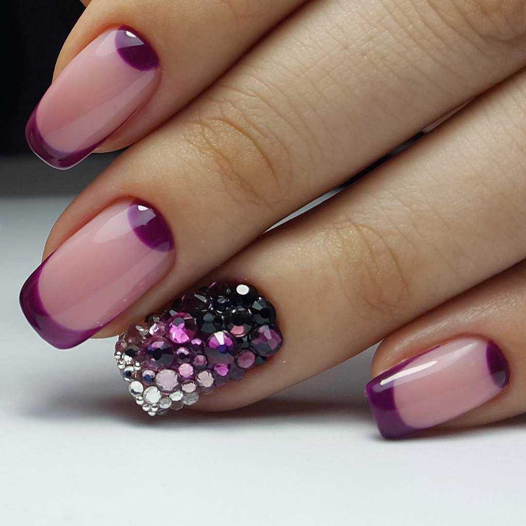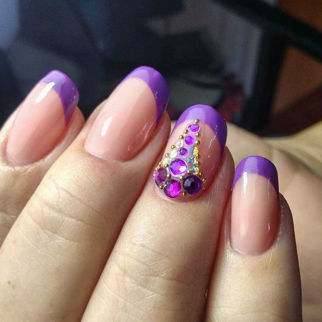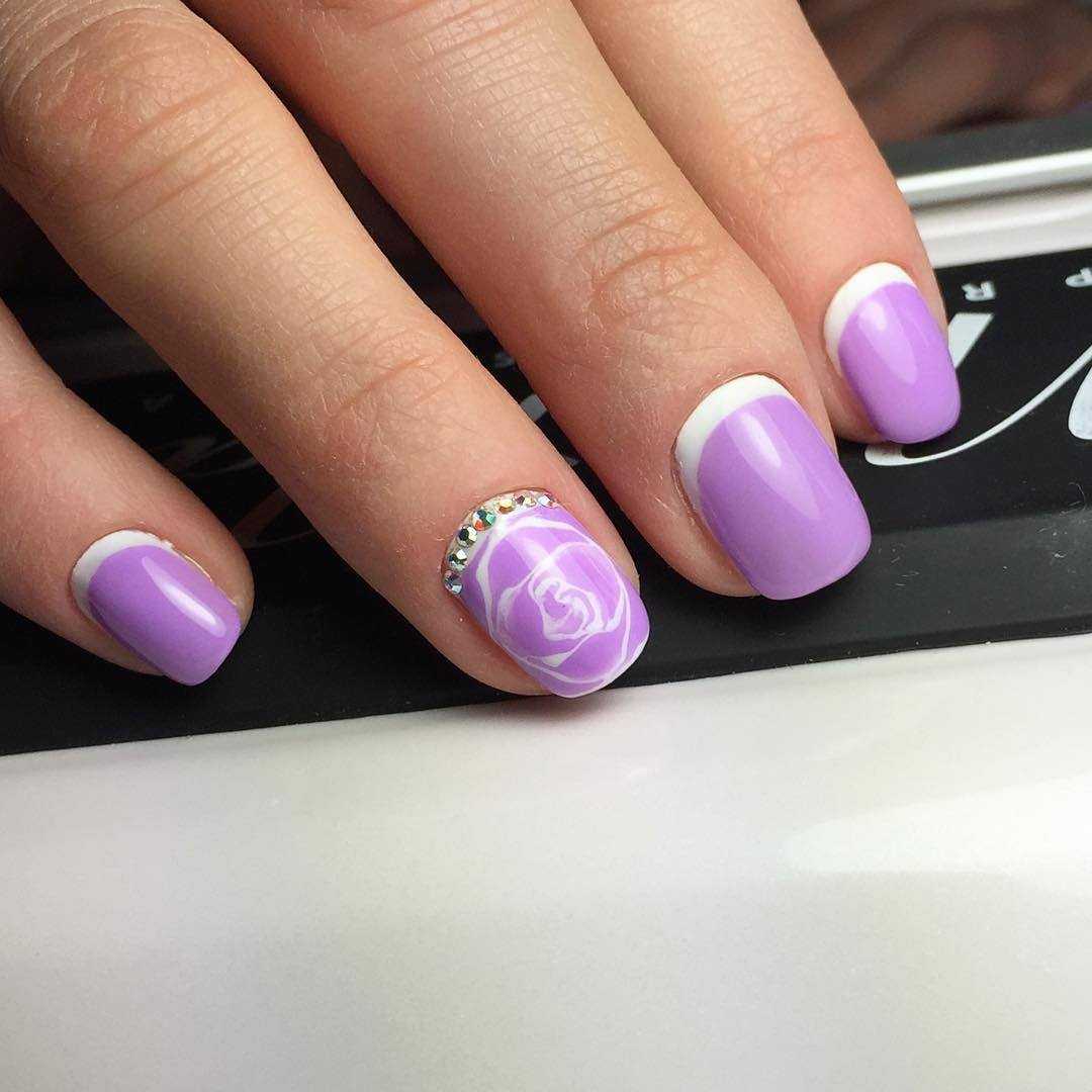 Ноготки короткой длины – это не преграда для выполнения прекрасного французского маникюра, ведь в этом году в моде природная красота. Выполнить данный дизайн можно прозрачной основе, нанеся улыбку лавандовым, фиалковым или сиреневым цветом. Альтернативным вариантом станет выполнение белой линии на любом покрытии из сиреневой палитры. Такой маникюр выглядит очень изящно, романтично и эффектно. Чтоб дополнить дизайн яркостью, используйте дополнительные элементы декора. Это может быть глиттер, стразы или бусинки