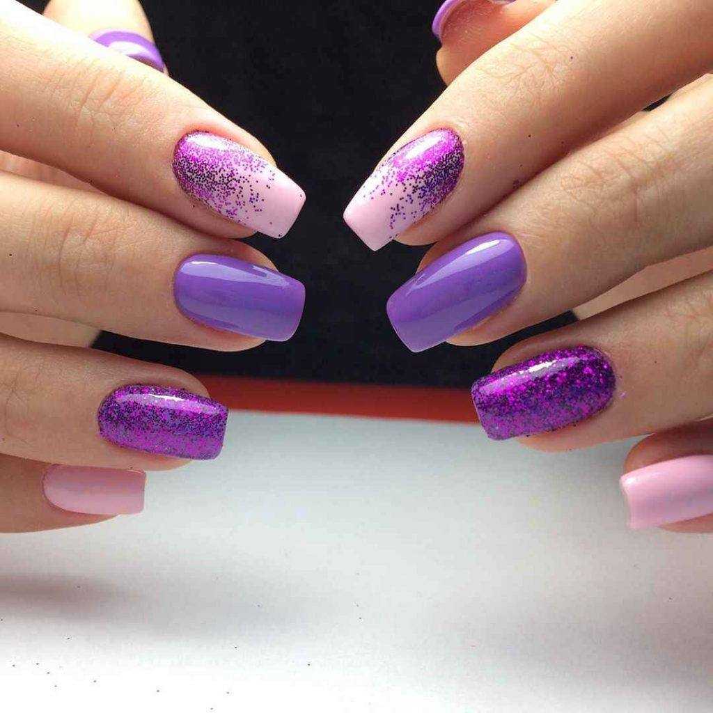 Что касается сиреневого покрытия, то девушки нередко выбирают именно его. Также пользуется популярностью вид градиента, который предполагает нанесение разного оттенка на каждый ноготок. Такой плавный переход смотрится невероятно красиво, особенно на коротких ноготках. А наличие блесток всегда будет уместным, но только в оптимальном количестве. Поэтому всегда предупреждайте мастера обо всех предпочтениях и тогда получите действительно прекрасный, современный маникюр.