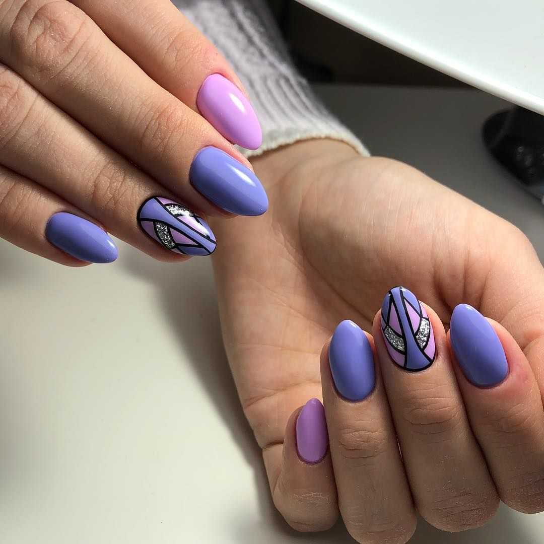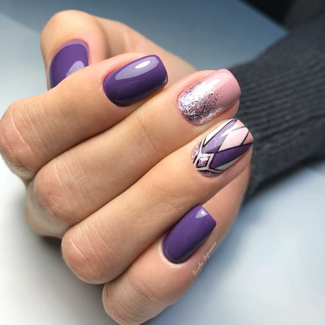 В тренде однотонное покрытие ногтей фиолетовым и серебряным цветом, декор с геометрическими формами, заполненными серебряным глиттером.