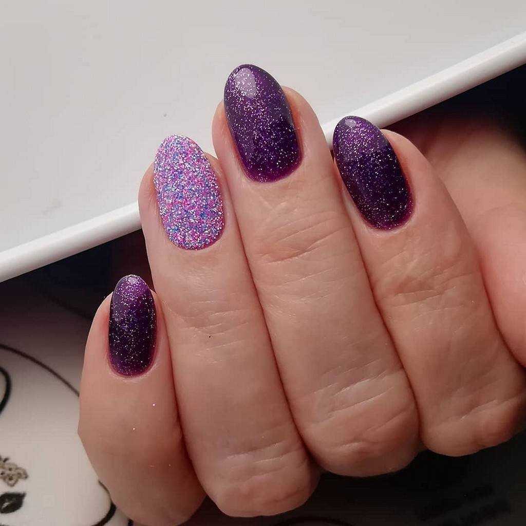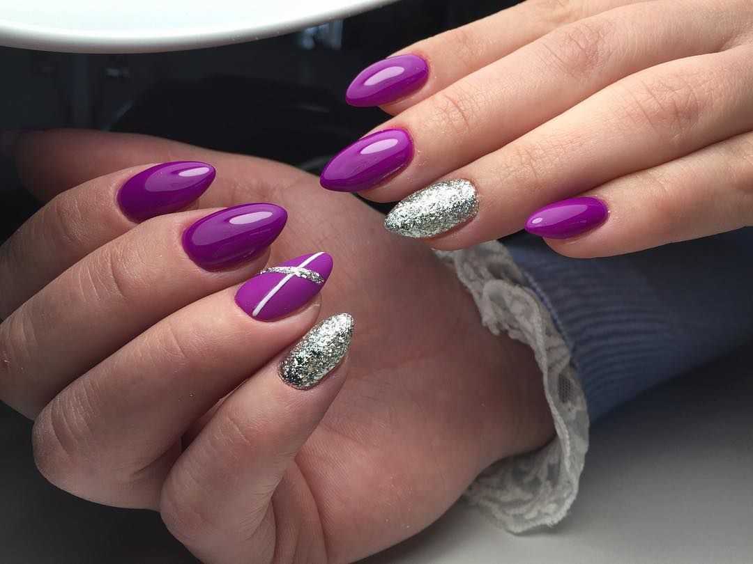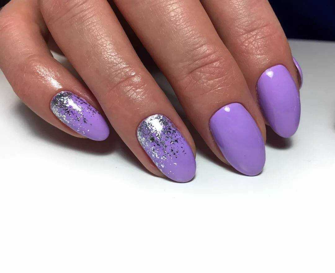 серебряный глиттер – универсальное решение для любого оттенка гель-лака. Фиолетовому цвету глиттер придаст нотки торжественности и шарма