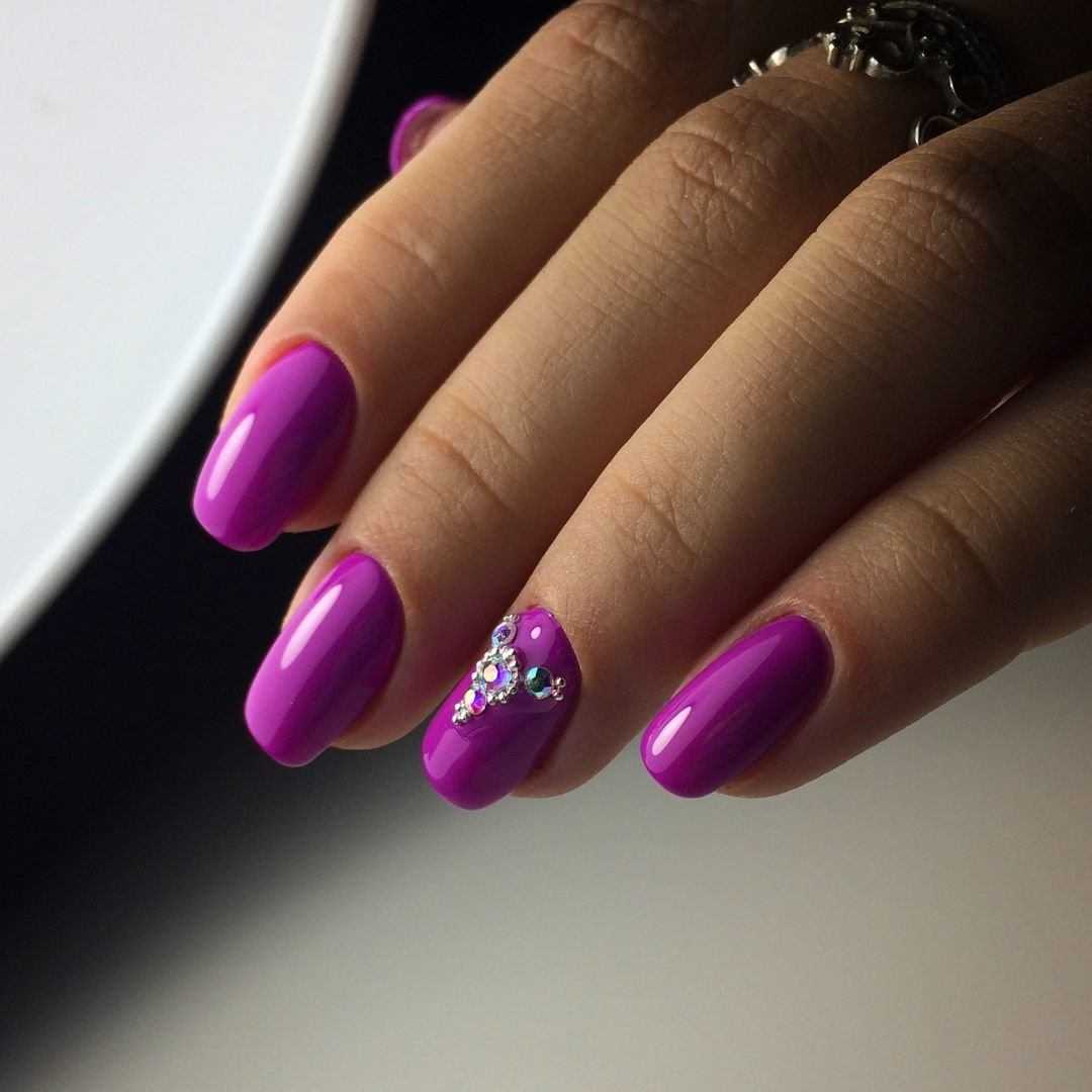 Фиолетовый цвет смотрится настолько насыщенно и глубоко, что может с успехом использоваться для создания однотонных нейл-артов. Дизайн великолепно смотрится как на длинных, так и на коротких ногтях.