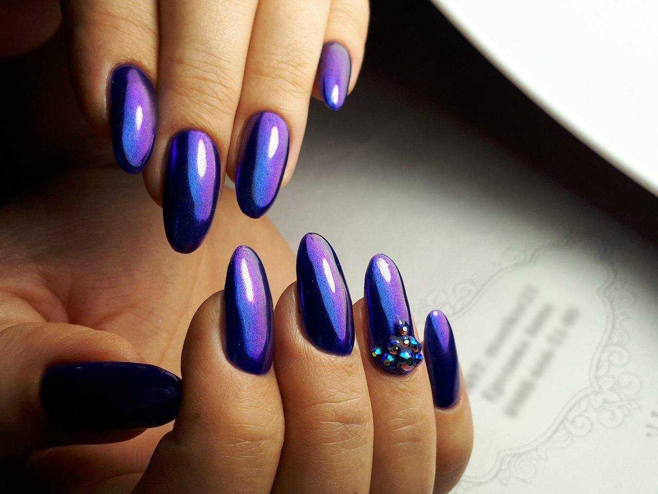 Что касается фиолетового маникюра, то он также красиво выглядит с зеркальной, голографической, жемчужной втиркой. Для создания маникюра можно использовать темно-фиолетовый гель-лак, что придает цвету насыщенность и глубину. Втирка также красиво выглядит со светлыми фиолетовыми оттенками. Визуально такой дизайн выглядит непередаваемо нежно и красиво. Такой маникюр часто дополняют декором с тематикой единороги, стразами и матовой текстурой.