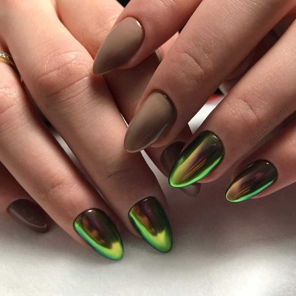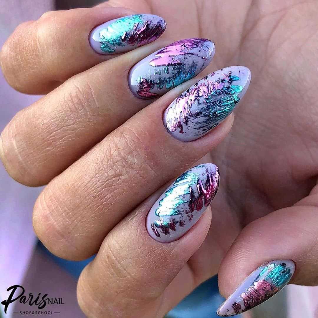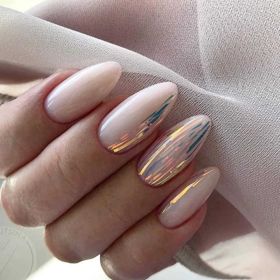 Всесторонний металлический тренд значительно повлиял и на дизайн маникюра 2020-2021 года. Высокую популярность в миндалевидном маникюре обрели металлизированные элементы декора, в частности фольга и металлическая втирка.