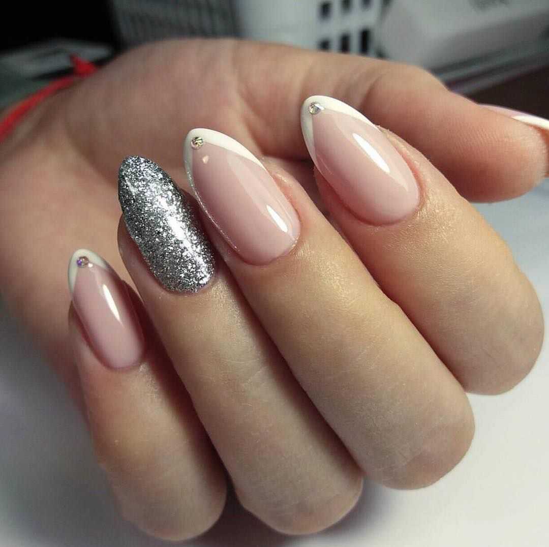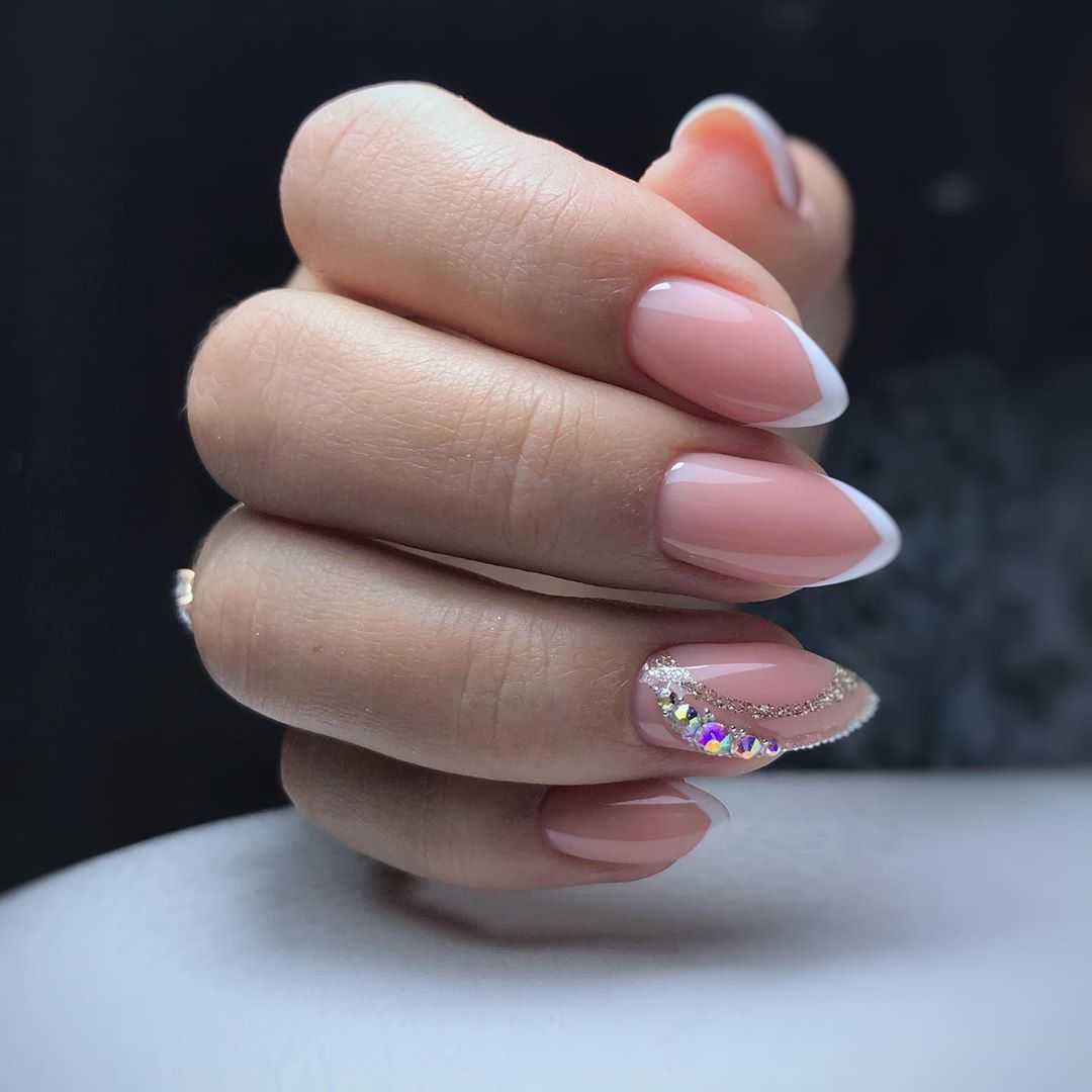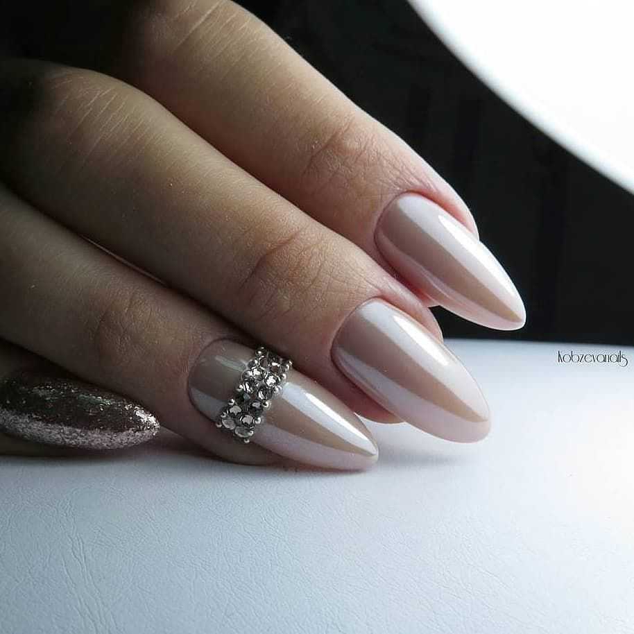 Что касается дизайна миндальных ногтей с нюдовым лаком — не стоит злоупотреблять. Это должны быть незначительные акценты в виде небольшого количества блесток, втирки, рисунка или наклейки.
