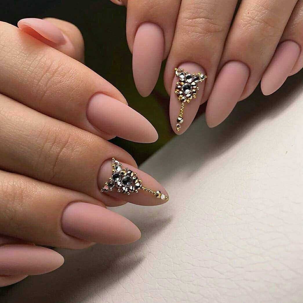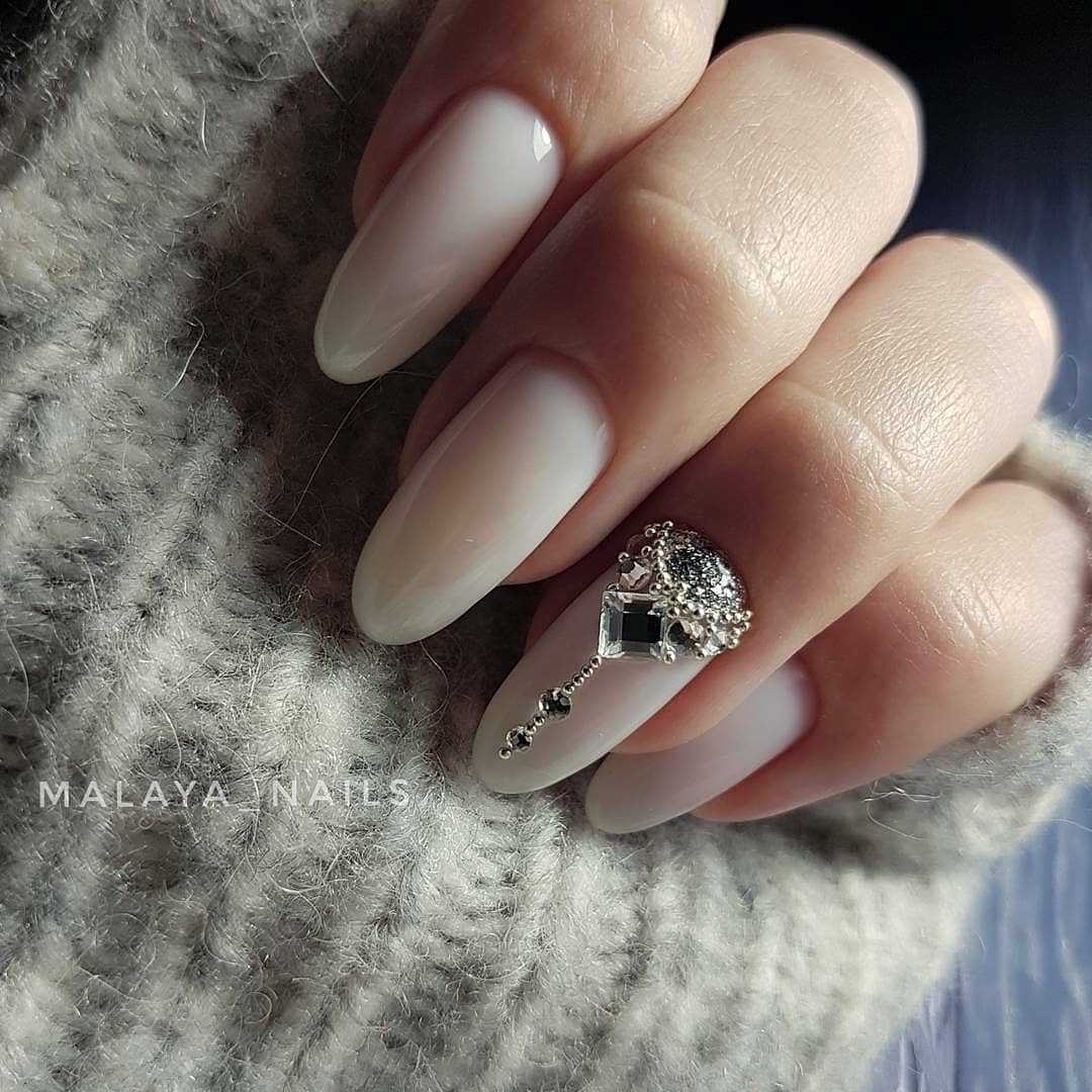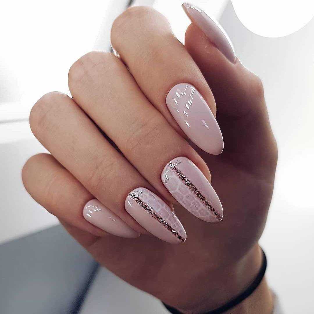 Что касается дизайна миндальных ногтей с нюдовым лаком — не стоит злоупотреблять. Это должны быть незначительные акценты в виде небольшого количества блесток, втирки, рисунка или наклейки.