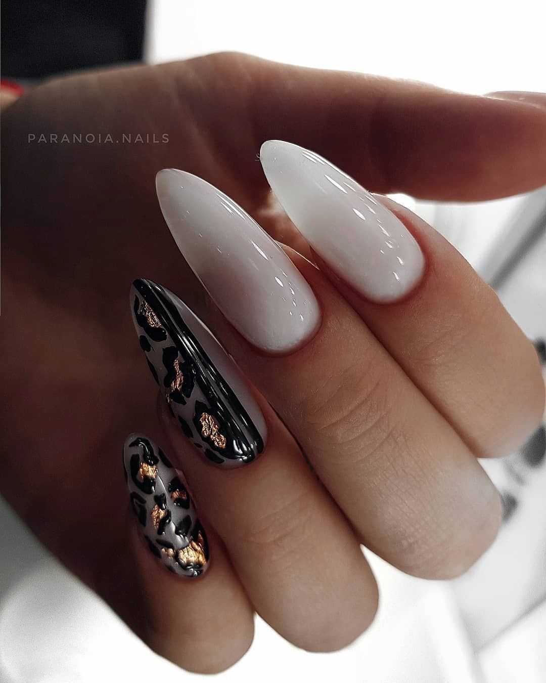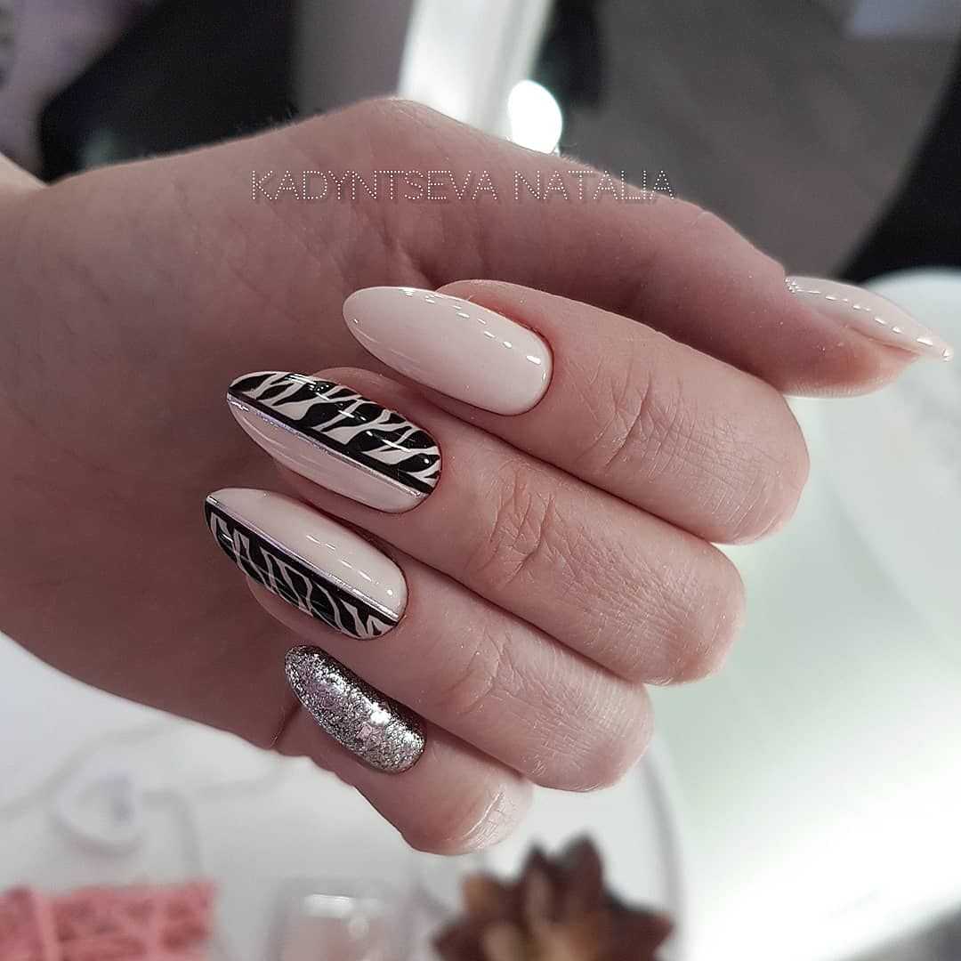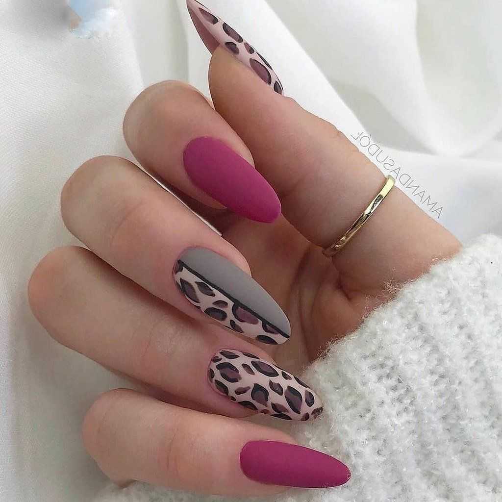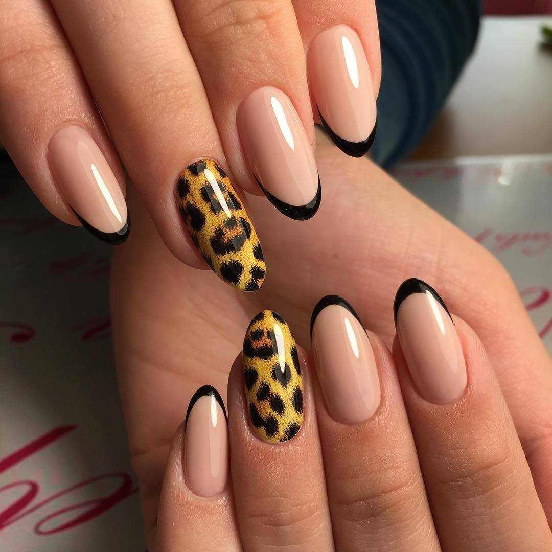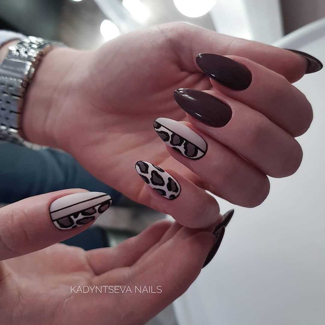 Один из самых популярных принтов 2020 – это анимализм. Это может быть принт леопард, тигр, зебра т.д. Используйте хищные принты только на 1-2 ноготках, остальные окрасьте однотонным гель-лаком. Эффектно смотрится маникюр с геометрическими формами, заполненными хищным принтом.