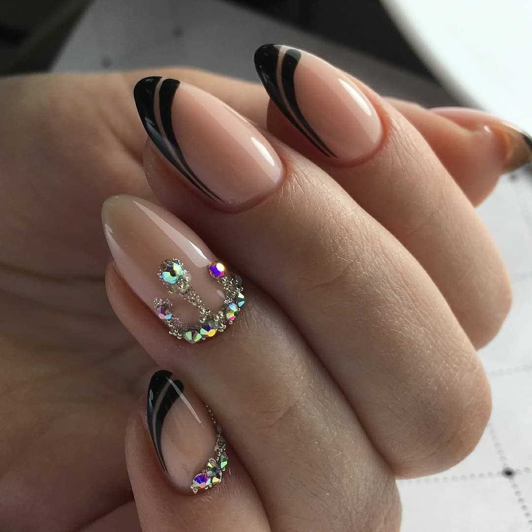 Что касается инноваций, то в тренде маникюр темных цветов лака с контрастными узорами и тематическими рисунками, геометрический дизайн миндалевидных ногтей, варианты с украшениями, цепочками, браслетиками, маникюр с конфетти, а также праздничный – с блестками и глиттером, стразами.