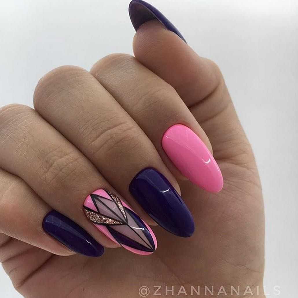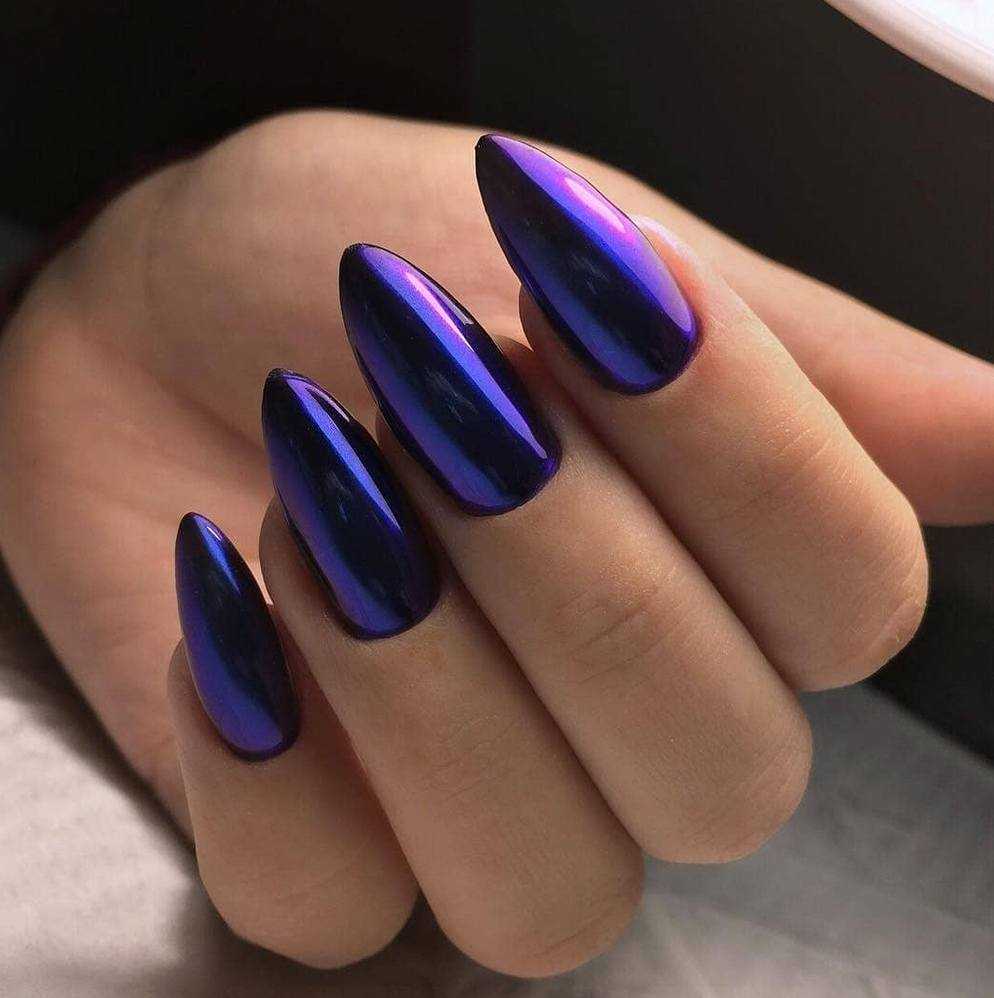 Яркие оттенки — фиолетовый маникюр на миндальной форме