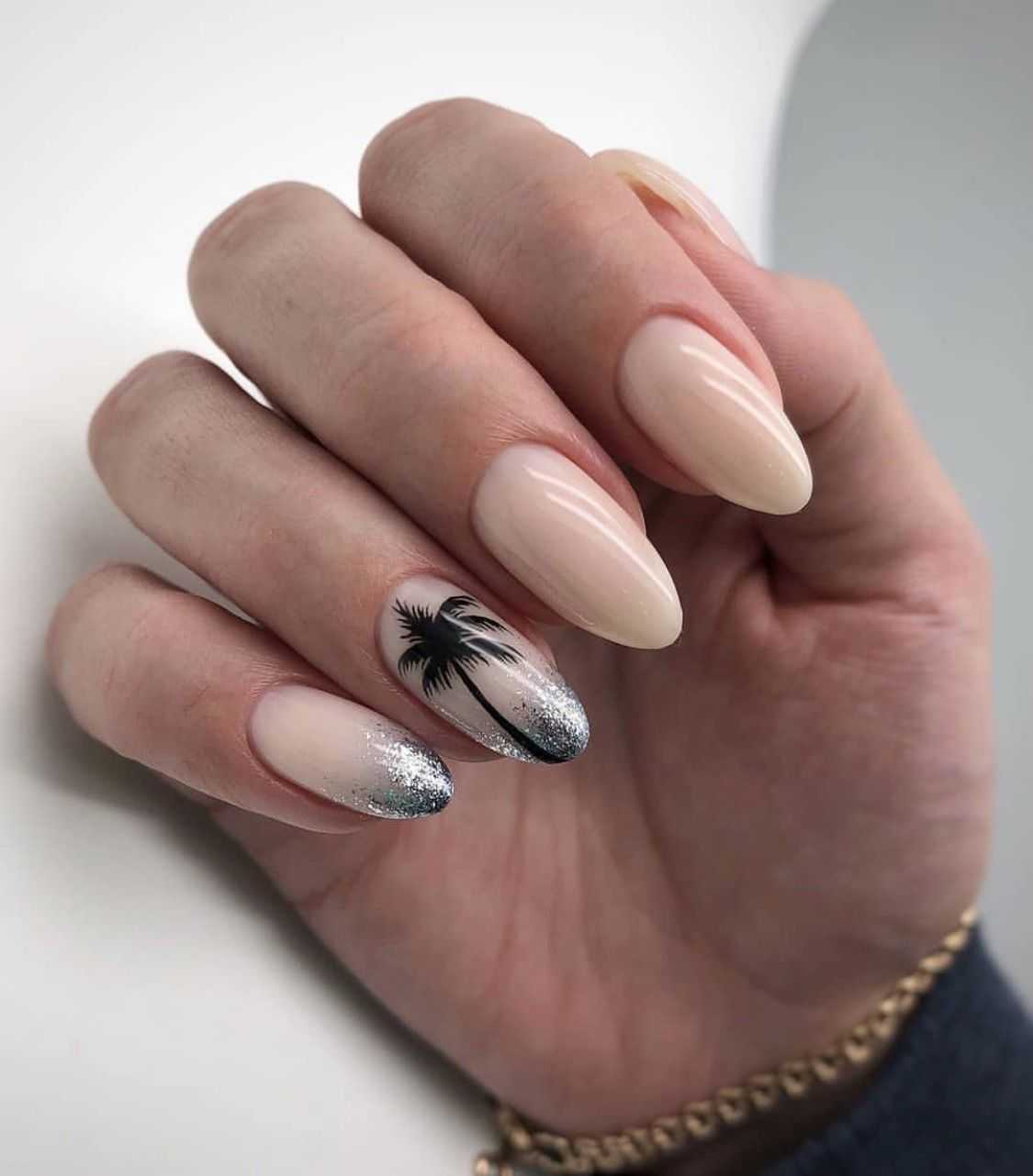 Не теряют своей актуальности в дизайне миндалевидного маникюра сверкающие блестки разных форм и размеров. В большинстве вариантов такого маникюра блестками покрывают отдельные ноготки, которые будут гармонично сочетаться с любым однотонным покрытием.