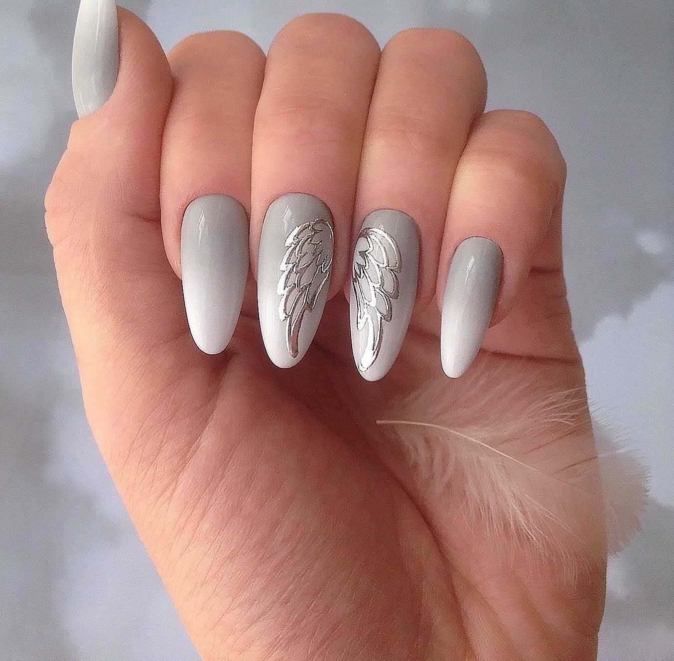 Плавный переход из темного в светлый серый на ногтях ввиде миндаля.