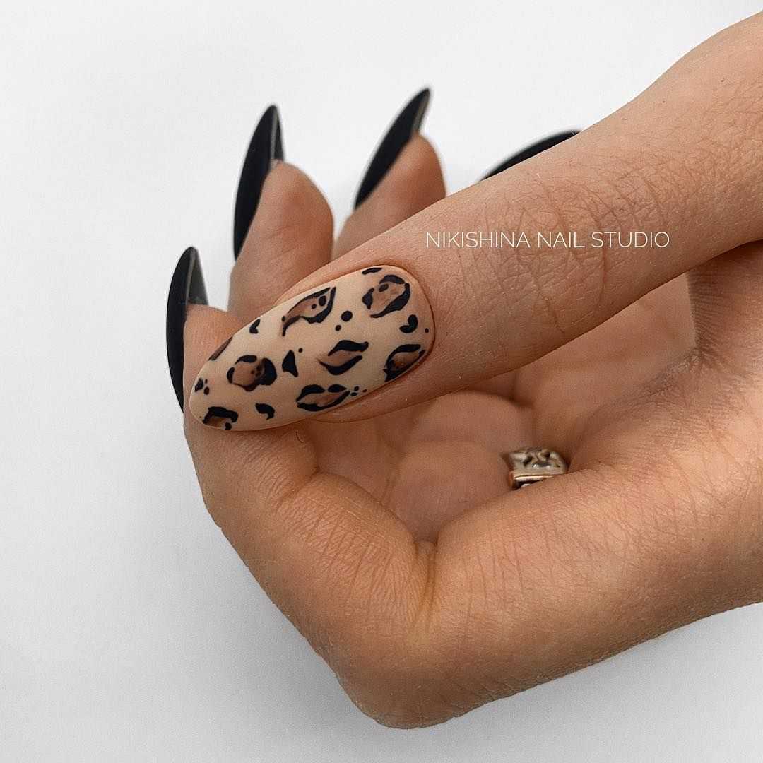 Анимализм отлично гармонирует с матовой текстурой. Используйте для дизайна темные оттенки: черный, бордовый, или напротив, светлые: кремовый, серый, коричневый и т.д. Принт анимализм должен быть главным акцентом всего маникюра, поэтому в таком нейл-арте лучше отказаться от декора стразами, бульонками или глиттером.