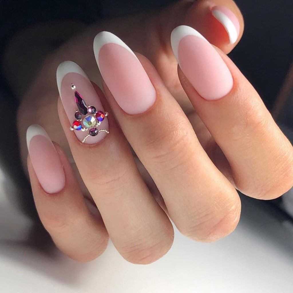 Женственный матовый маникюр в технике французский маникюр с украшением из страз.