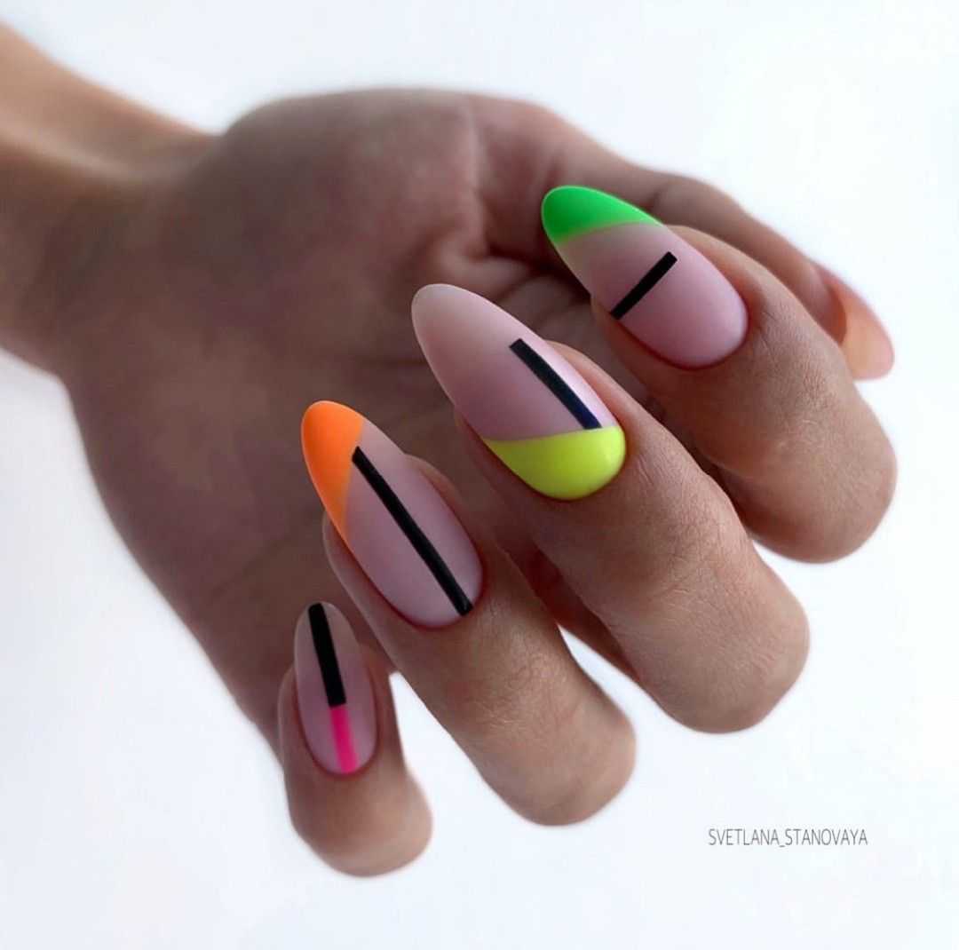 Яркий летний градиент на длинных миндалевидных ногтях.