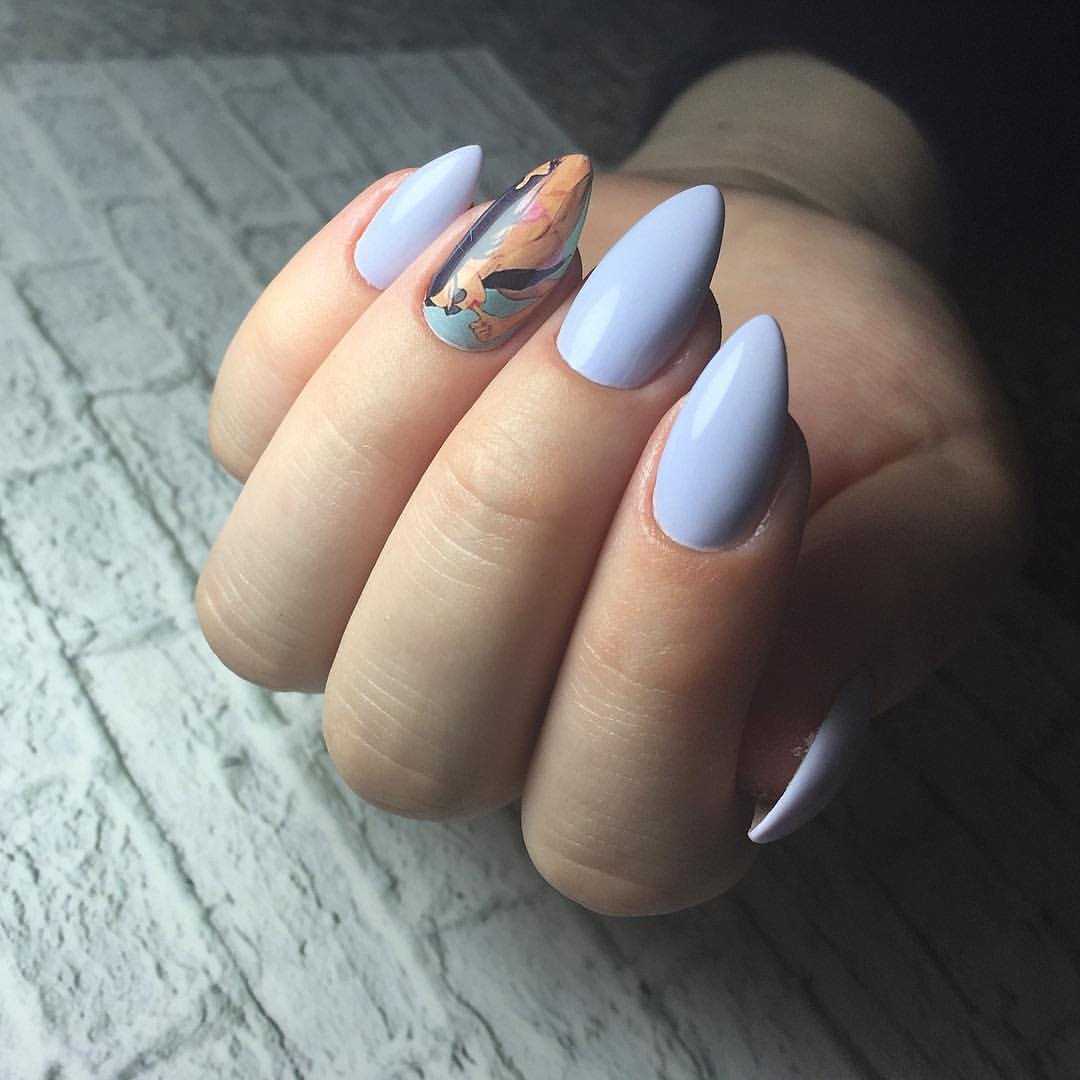 Фиолетовый и его оттенки — несомненный тренд нынешнего сезона. Миндальные ногти как нельзя лучше подходят по этот цвет лака. Выбирайте идеи — матовое покрытие, самые разные дизайны или блестящий глянец — все это будет на пике моды.