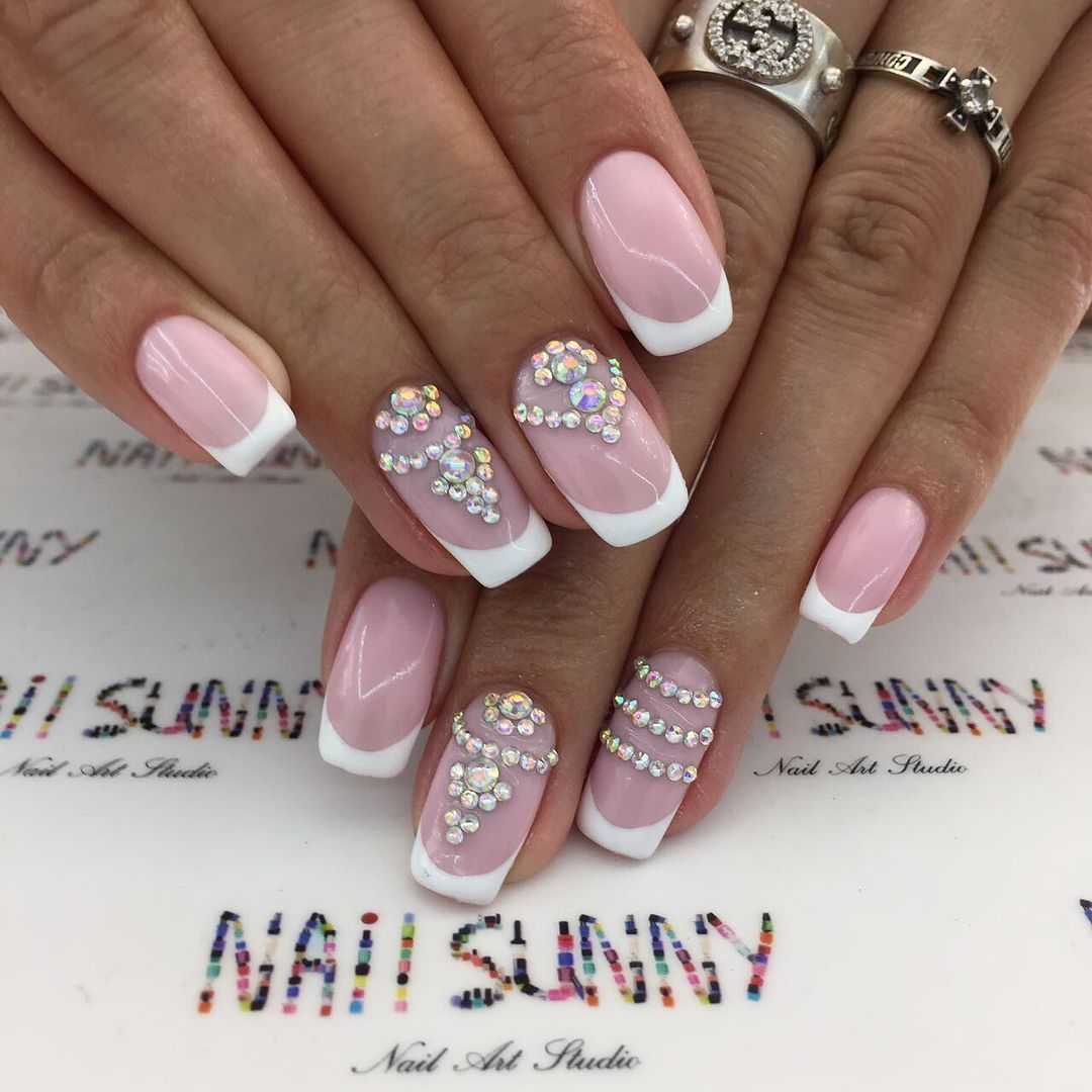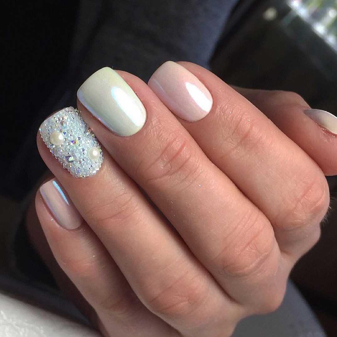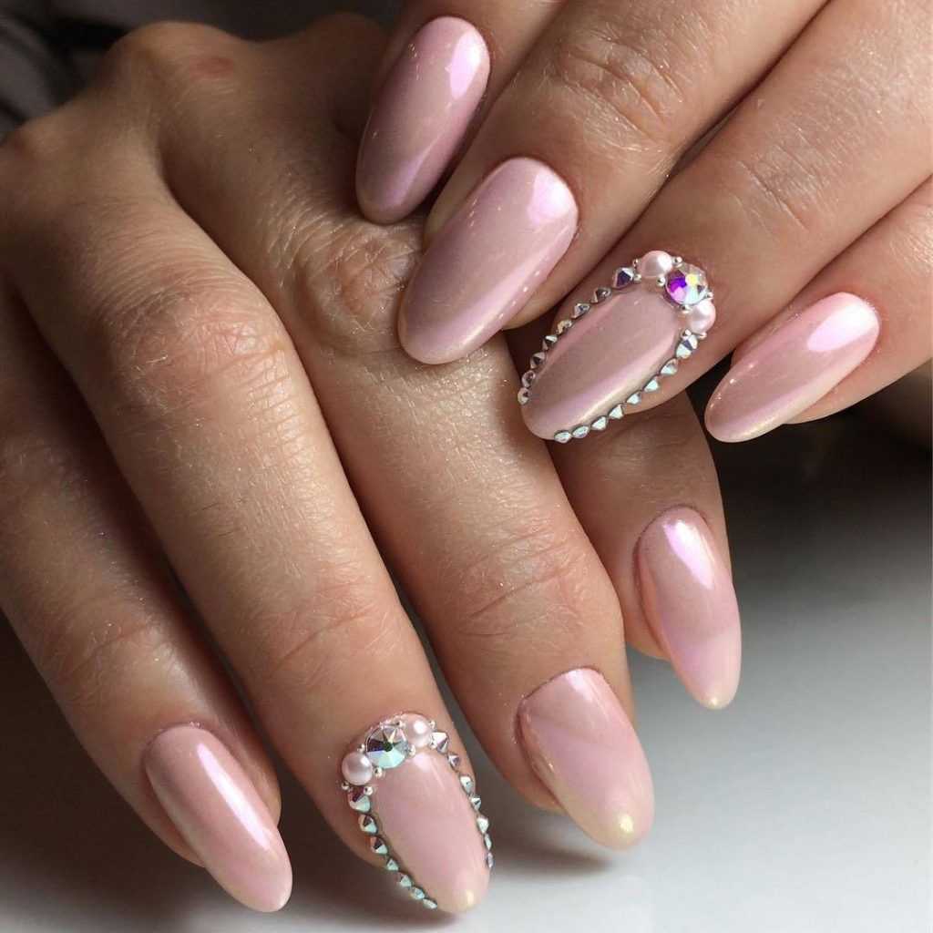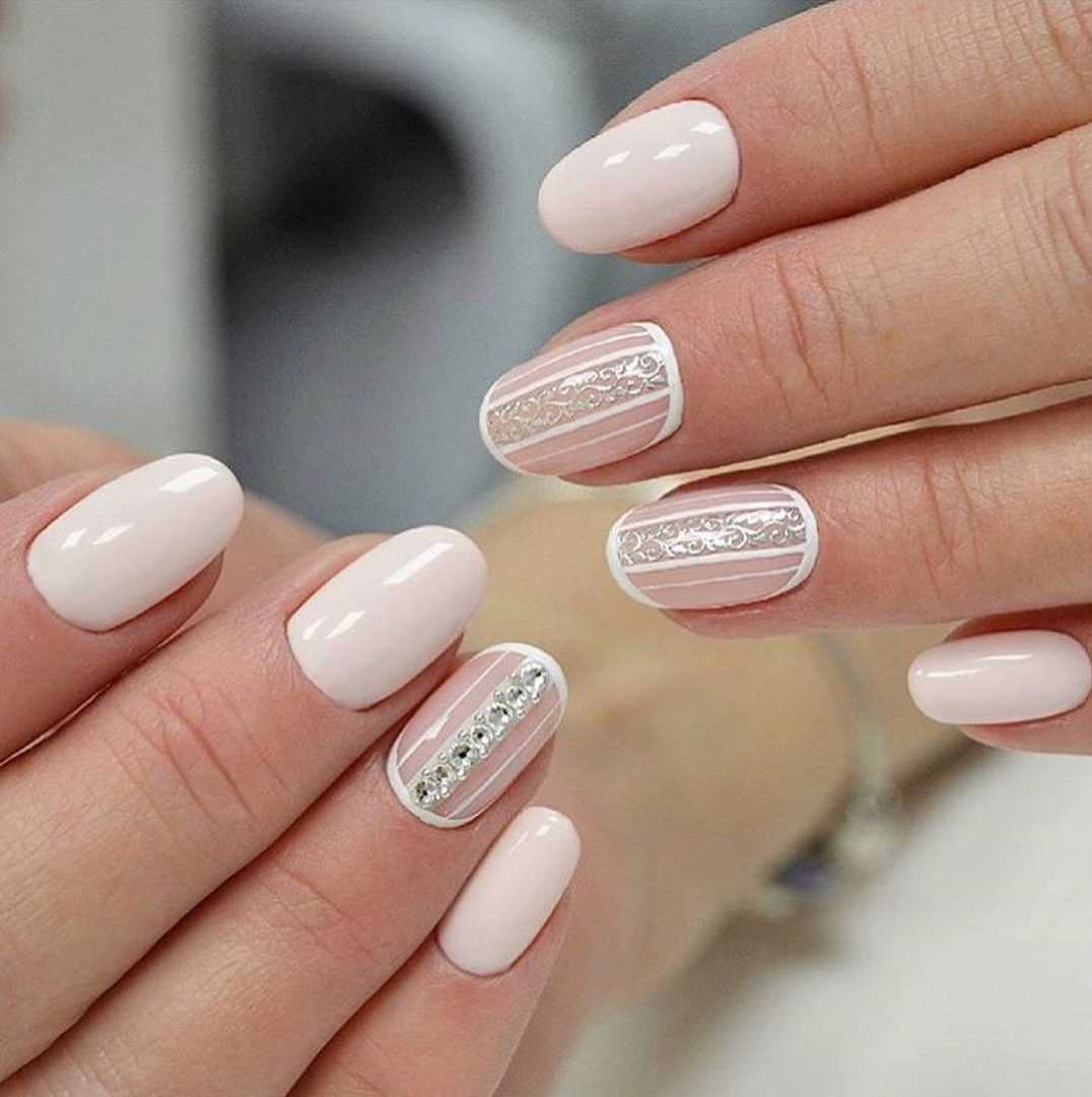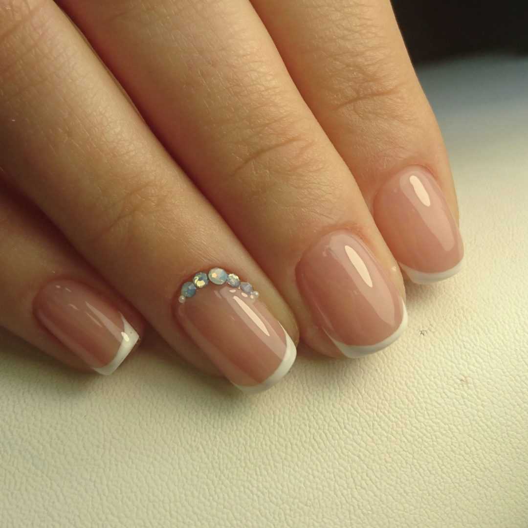 Если вы хотите чего-то более легкого и простого, вы можете покрыть все ногти нежно-розовым, молочным или телесным гель-лаком и украсить один или два ногтя прозрачными стразами или блестками.