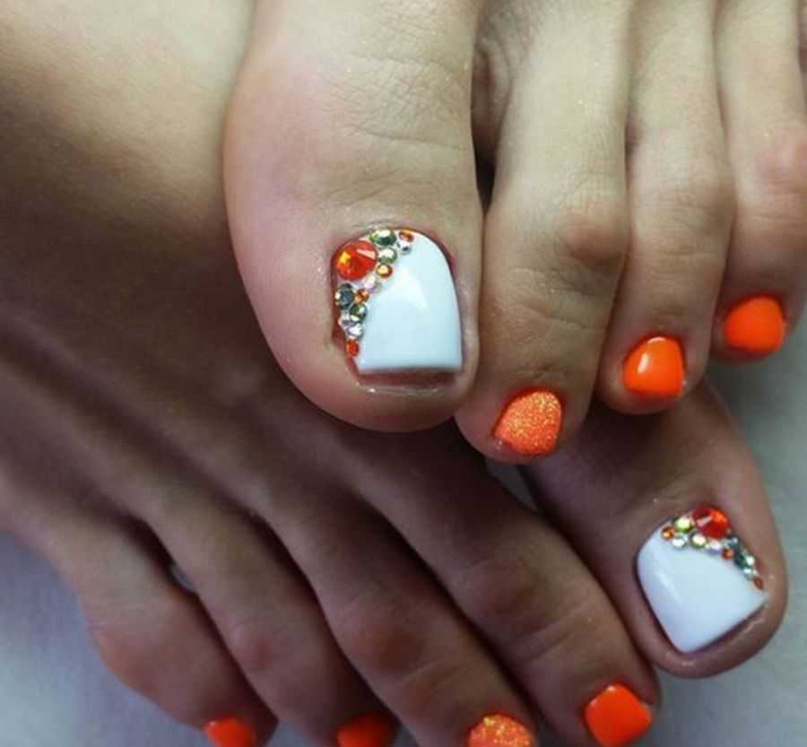 Не менее популярным является оттеночный педикюр, при котором ногти красят разными тонами одного цвета либо покрывают их прозрачным средством, после чего наносят сам цвет. Уникальным решением будет использование, например, желтого и оранжевого оттенков.