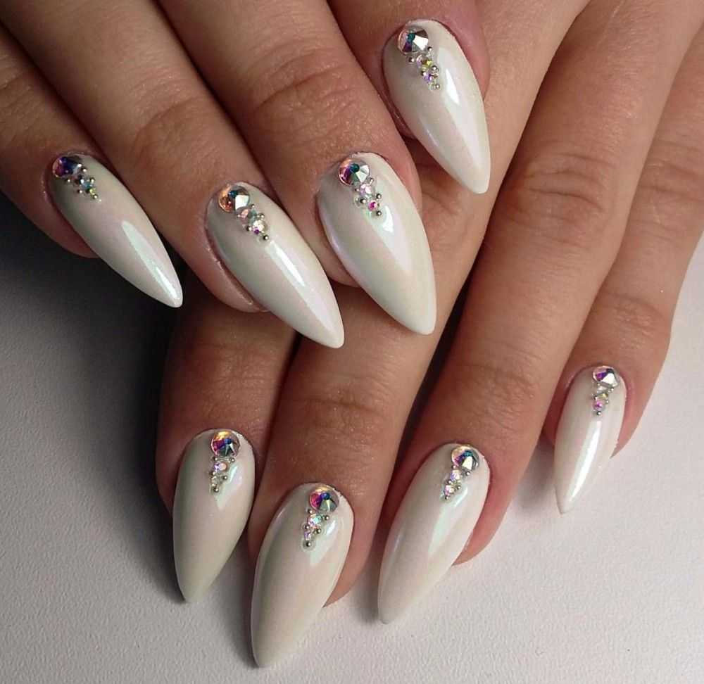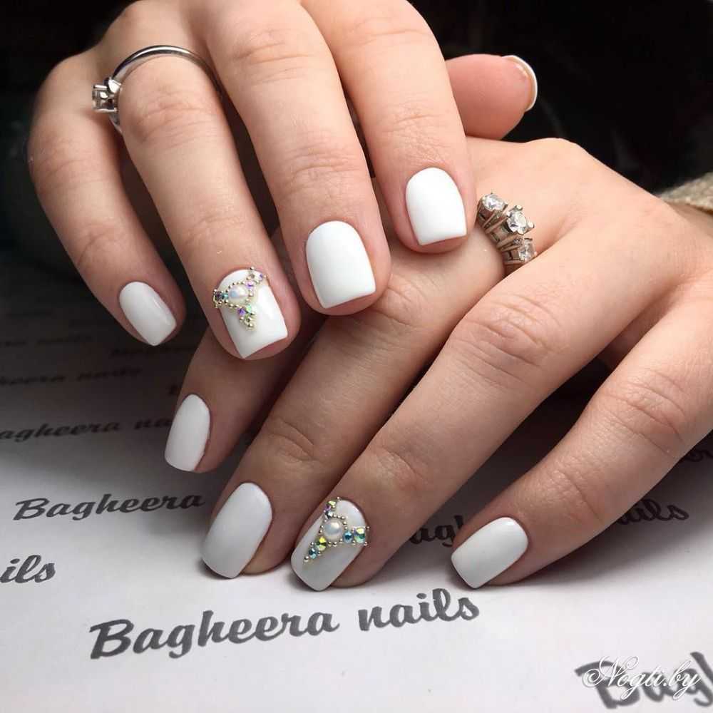 На длинных ногтях квадратной формы очень красиво и элегантно будет смотреться белый гель-лак с блестками и стразами.