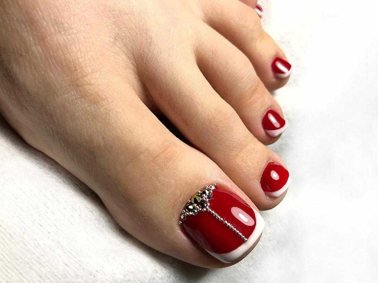 Дизайн с ромбом, выложенным стразами на большом пальце, отлично сочетается с темными тонами лака. Лунный маникюр со стразами в красном цвете — шикарный вариант для лета 2022 года. При создании темного педикюра рекомендуется использовать матовый топ, такой педикюр будет смотреться наиболее эффектно и выразительно.