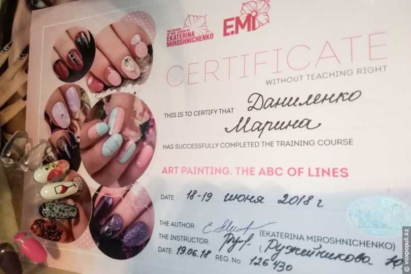 — Я обучилась в декабре 2010 года в Центре ногтевого сервиса Elite Nails — одном из лидеров в этой сфере. Во время учёбы показала хорошие результаты, и хозяйка салона Татьяна Тунда предложила мне остаться работать у неё. Там я работала на проценты.