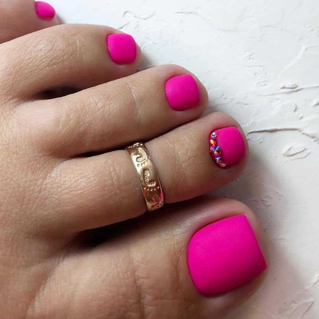 Однотонный педикюр можно воплощать в блистательном глянце или в бархатном матовом исполнении. Стразы рекомендуют наносить на большой палец, а если камешки очень маленькие, их можно расположить по одному на каждый ноготок. Стразы можно выложить в хаотичном порядке или в виде определенной фигуры. Самым главным в выборе дизайна для педикюра будет подборка актуального цвета лака. Какой бы вариант Вы не выбрали, прислушайтесь к советам опытного мастера.