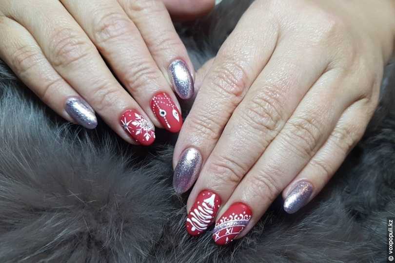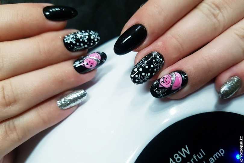 Не забывайте о том, что ваш новогодний дизайн ногтей должен соответствовать по стилю наряду и прическе. Если вы выбрали для вечеринки лаконичное и простое платье, узор на ногтях может быть изысканным и сложным. Если же платье отличается затейливым фасоном, украшено стразами, вышивкой и дополнительной фурнитурой, отдайте предпочтение простым и лаконичным видам маникюра.