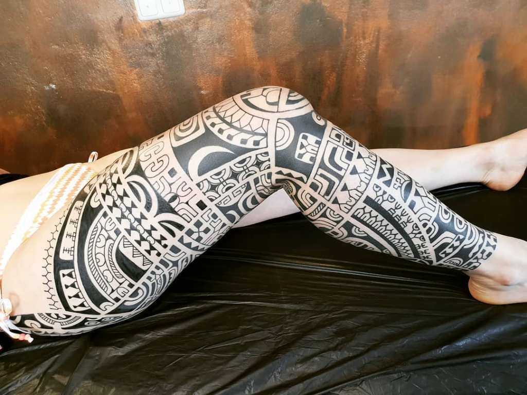 Чаще всего, узор на бедре представляет собой мандалу, цветы, кружева или племенные символы, нанесенные на боку.