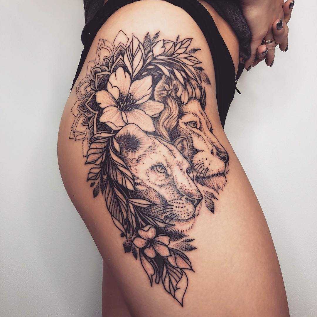 Женские и мужские татуировки на бедре востребованы потому, что кожа в этом месте почти не подвержена возрастным изменениям. Значение тату у мужчин и женщин несколько отличается. Девушки любят набивать цветы, абстракции, им может понравиться милое животное или небольшая птица, кокетливая подвязка, изящный узор. Цветное изображение или белая тату на бедре – тоже чаще выбор женщины. Последние годы стали популярны мистические тату, например, ловец снов. Мужские абстракции обычно в стиле трайбл, эпические картины и внушительного вида хищники.