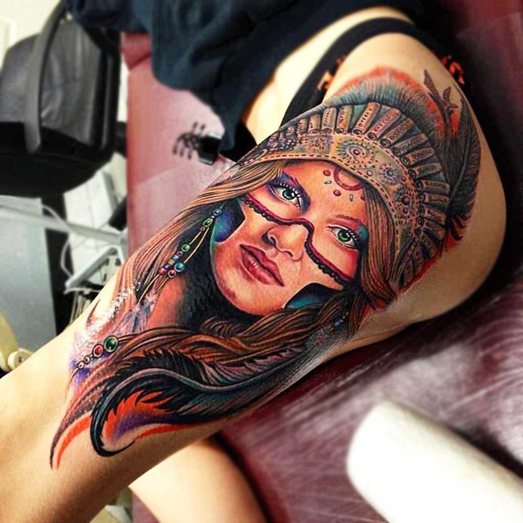 Внешняя поверхность бедра дает большой простор для воплощения художественных задумок. Благодаря объему здесь можно располагать целые арт-полотна. Эта зона считается олицетворением интимности и чувственности, поэтому татуировки на бедрах так привлекают взоры мужчин.
