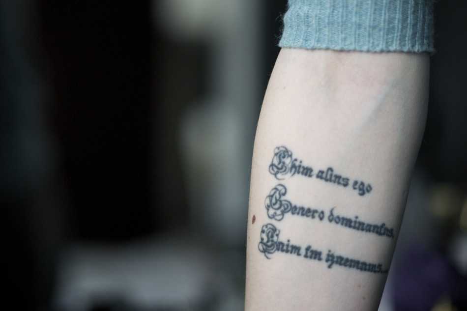 Плечо и предплечье для надписей подходят идеально — есть место разместить любые философскую мысль, девиз или имена любимых людей. Как вариант, можно воспользоваться следующими изречениями: «Audaces fortuna juvat» («Счастье сопутствует смелым»), «Tu ne cede malis, sed contra audentior ito» («Не покоряйся беде, но смело иди ей навстречу»), «Vivere militare est» («Жить — значит бороться»)