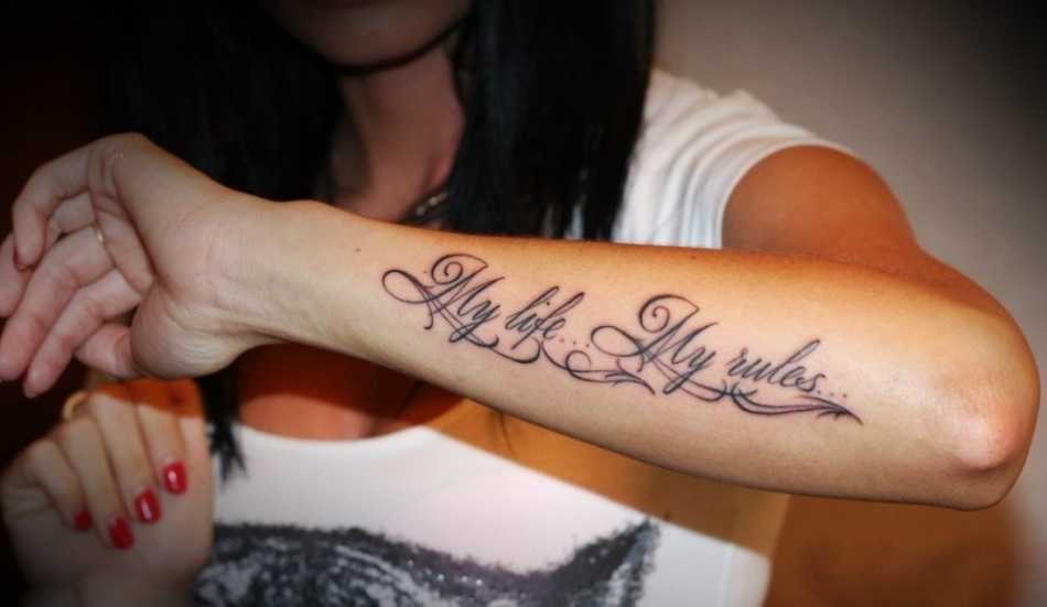Длинная татуировка-надпись отлично смотрится и на наружной стороне предплечья![]()