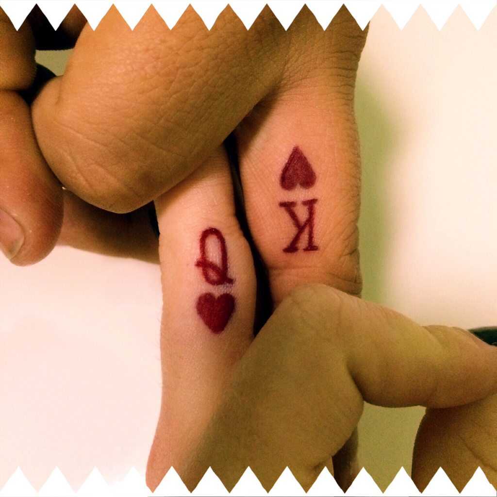 Многие пары делают одинаковые татуировки. Очень часто используется дата свадьбы, обозначения короля и королевы в виде императорских головных уборов или привычных изображений с колоды карт для карточных игр. Большая часть парных тату выражает чувства влюбленных. Очень актуальны эскизы в виде штрих-кодов, знаков бесконечности, линии кардиограмм. Большинство мастеров тату рекомендуют выбирать в качестве парных нательных рисунков общепринятые изображения. Жизнь может сыграть с вами злую шутку, и определенные обстоятельства вынудят вас расстаться. В таком случае соединяющиеся воедино татуировки будут абсолютно неуместными. Не стоит наносить имя партнера, которое в дальнейшем будет напоминать об отношениях. А вдруг воспоминания станут неприятными?