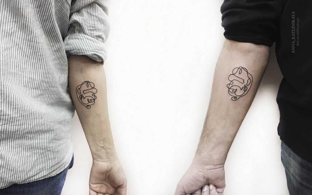 Идея парных тату в наши дни пользуется немалой популярностью, и подобное решение сегодня рассматривается не только в качестве демонстрации взаимных чувств между влюблёнными. Стильные идеи одинаковых или дополняющих друг друга эскизов востребованы между друзьями, родными и близкими по духу людьми. Также очень часто парные тату наносят на тело представители какой-либо организации или напарники по службе.