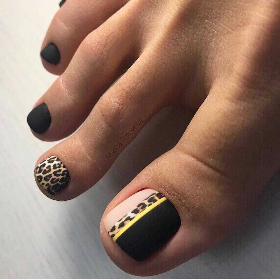 Эффектным вариантом педикюра считается дизайн, выполненный матовым покрытием, в котором присутствует черный фон и небольшой рисунок. Орнамент можно нанести только на ноготь большого пальца либо выделить несколько ногтевых пластин.