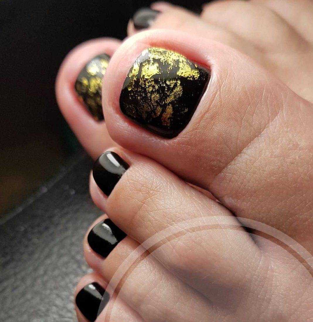 Важно, чтобы педикюр в черно-золотом цвете выглядел легко и лаконично. Оба цвета достаточно «тяжело» смотрятся на ногтях, поэтому не стоит нагружать дизайн сложным и объемным декором